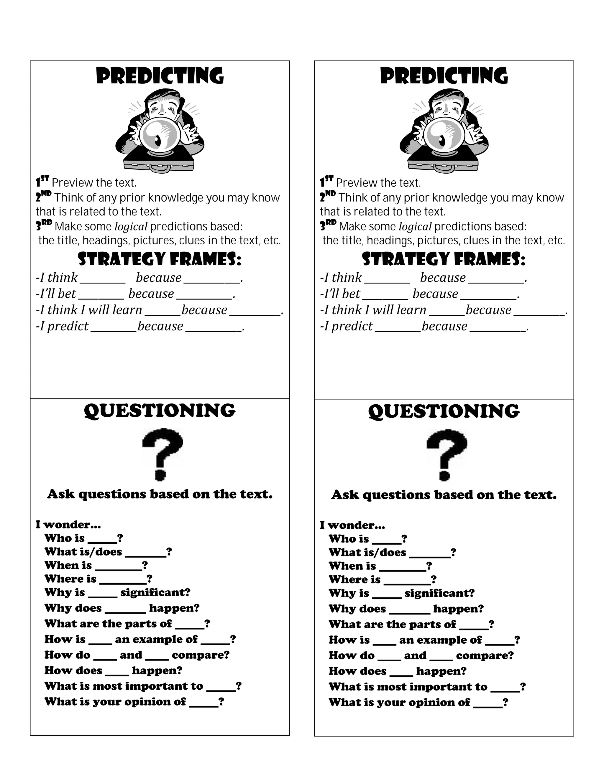 The document outlines strategies for predicting, questioning, clarifying, and summarizing texts. It provides sentence starters and frames for making logical predictions based on text cues, generating questions to enhance comprehension, and identifying difficult content while reading. Additionally, it emphasizes the importance of extracting central ideas and authorial purpose while summarizing.