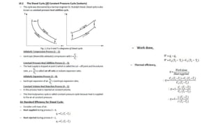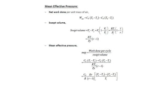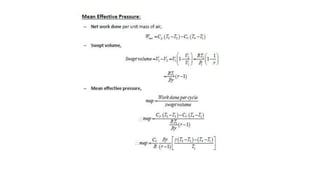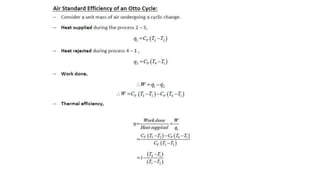 This document describes the reciprocating internal combustion engine. It discusses key components like the cylinder, piston, connecting rod and crankshaft. It also covers the classification of IC engines based on factors like fuel type, cooling method and cylinder arrangement. The four main components of a four-stroke engine are the intake, compression, power and exhaust strokes. The air standard Otto cycle and Diesel cycle are theoretical cycles that simplify actual engine conditions. While useful for approximations, the actual engine cycle has additional complexities and losses compared to the idealized cycles.