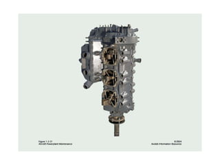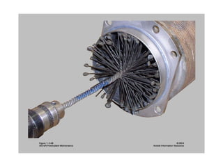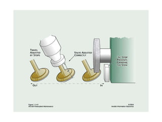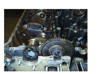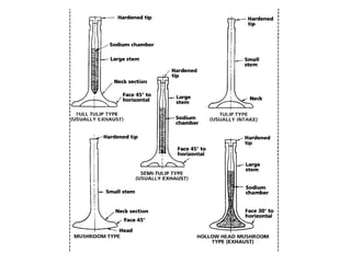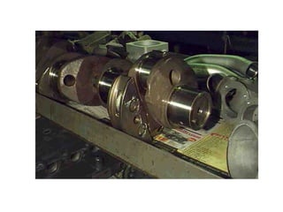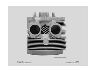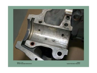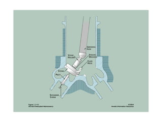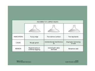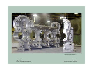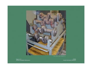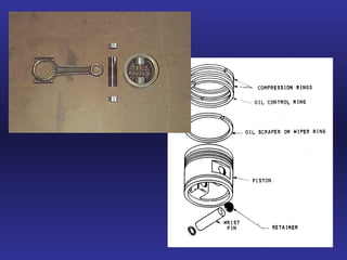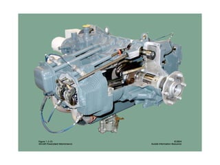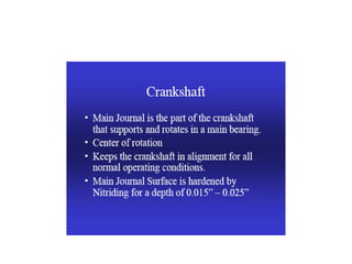 The document summarizes key reciprocating engine components. It describes how the crankshaft converts the reciprocating motion of the pistons into rotation to drive the propeller. It also discusses the cylinder head, barrels, valves and valve train including camshafts, lifters, pushrods and rocker arms that control airflow into and out of the cylinders. The crankcase houses and supports these components to transfer power from the pistons.
