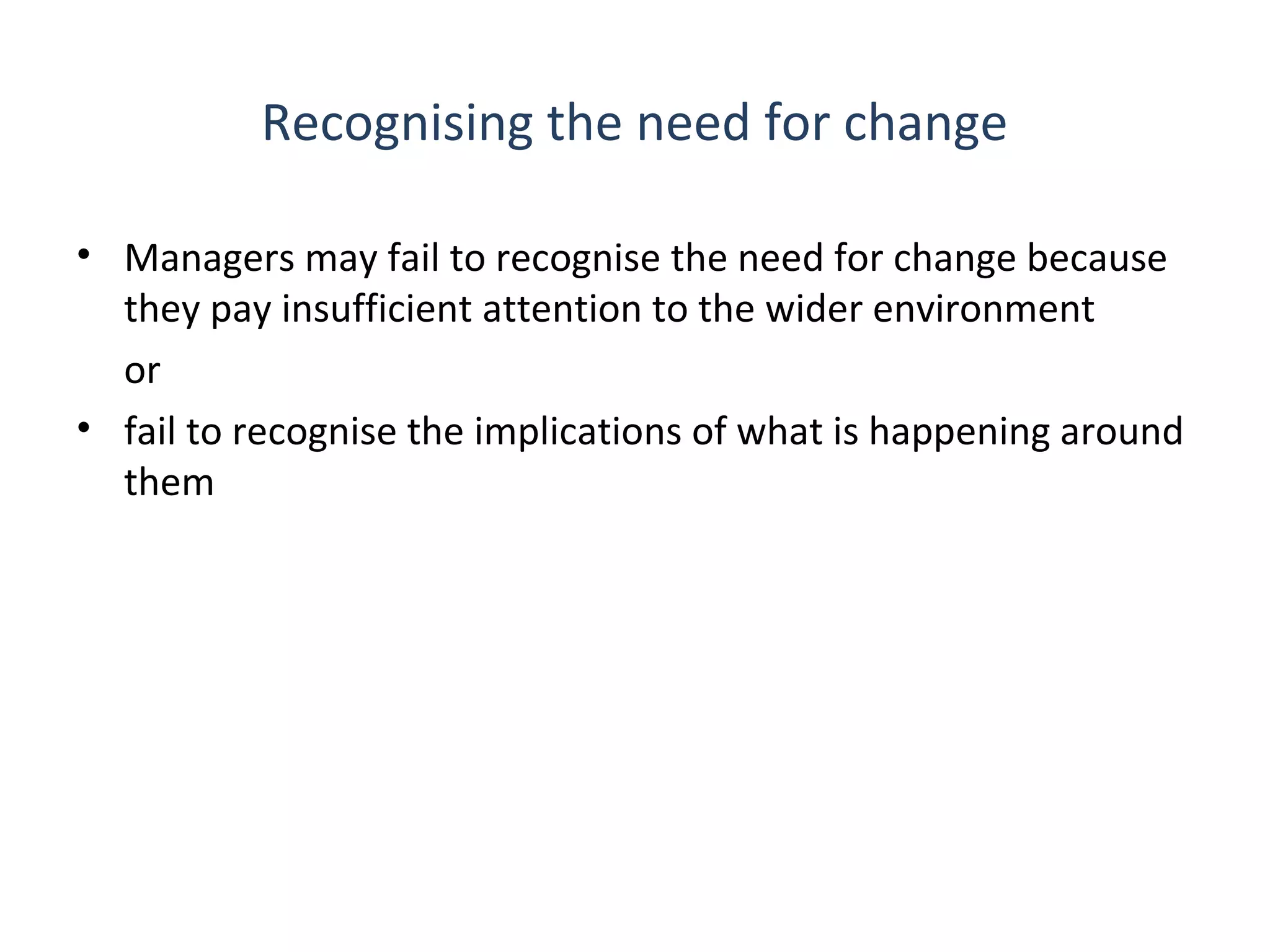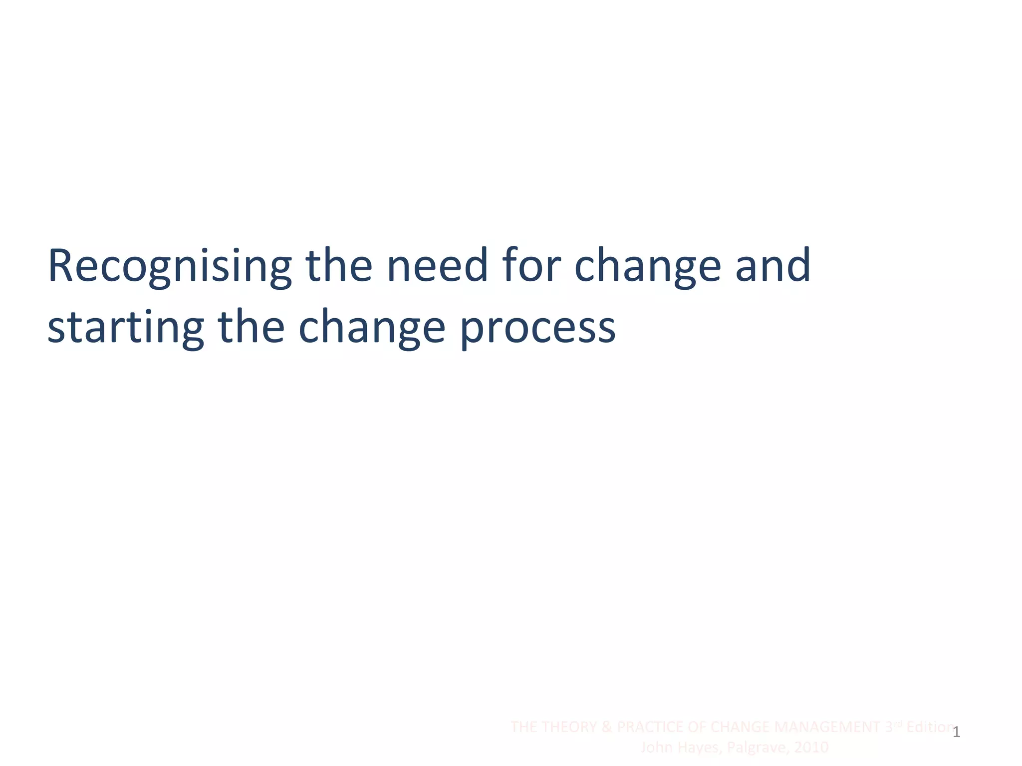 The document discusses recognizing the need for change and starting the change process. It states that managers may fail to recognize the need for change if they are not attentive to their external environment or changes happening around them. It also discusses how prolonged success can lead organizations to become complacent and less innovative. The document advocates widening opportunities for employees to provide input and playmaker roles to improve an organization's ability to identify the need for change. It also states that starting the change process involves selecting a change agent, developing the change relationship, identifying who needs to change, and clarifying the issues.