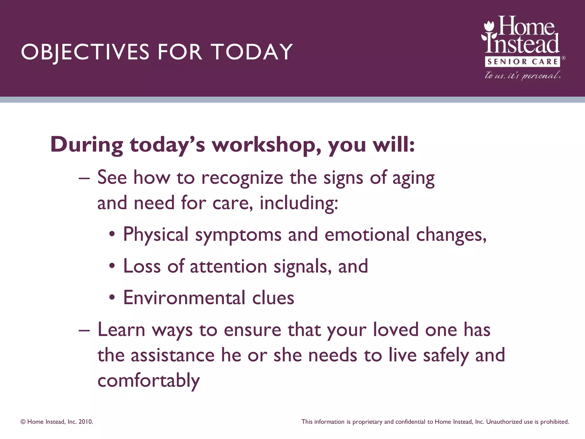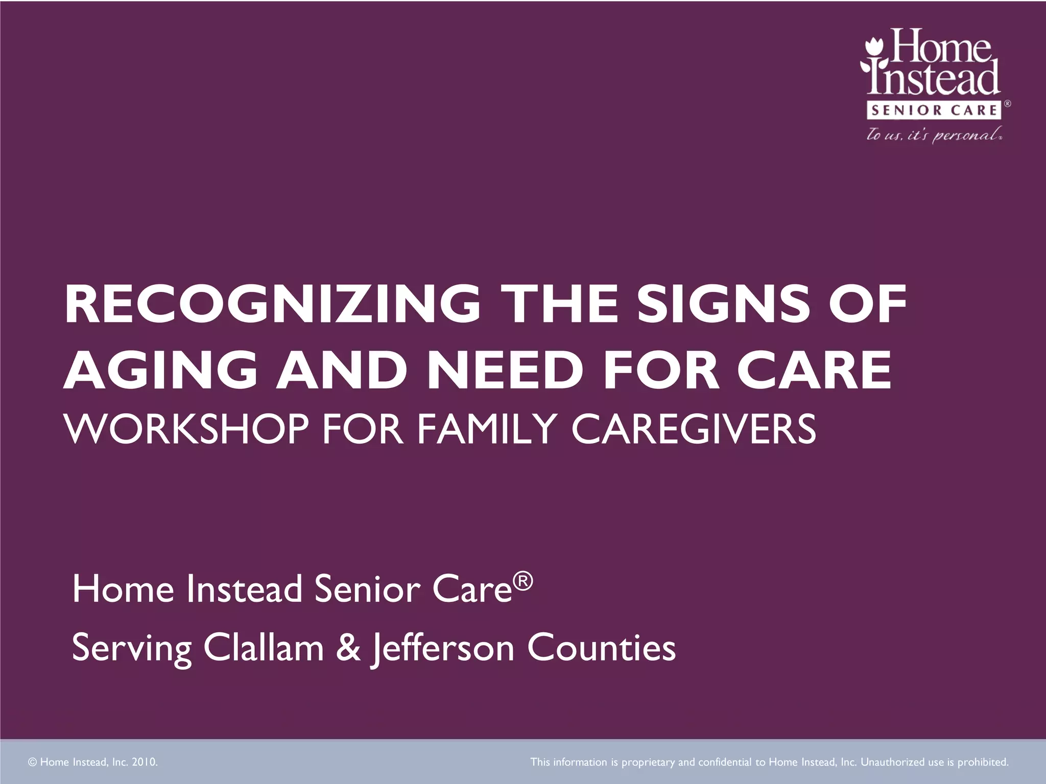 The workshop aims to help family caregivers recognize the signs of aging and the need for care in their loved ones, covering physical symptoms, emotional changes, and environmental clues. Key focuses include identifying personal hygiene neglect, memory loss, and unsafe living conditions, along with steps to take action and seek help. Resources for further assistance are provided, including local agency contacts and home care services.