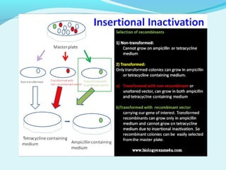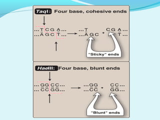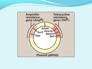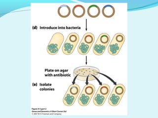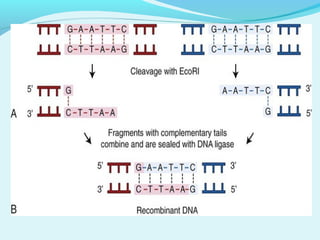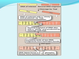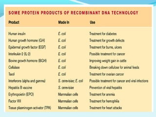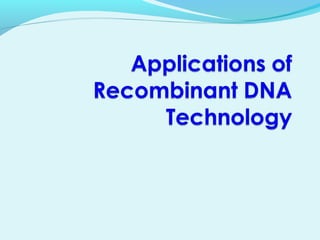 Recombinant DNA technology involves transferring genes between organisms using artificial means. It works by combining DNA from different sources into a single molecule. The process involves generating DNA fragments, inserting the fragments into vectors, introducing the vectors into host cells, and selecting clones containing the recombinant DNA. Common tools used include restriction enzymes to cut DNA, vectors like plasmids to carry DNA, bacterial hosts like E. coli, and techniques like transformation and selection to introduce and identify recombinant DNA. Applications include analyzing gene structure, producing pharmaceuticals, genetically modified organisms, and gene therapy.