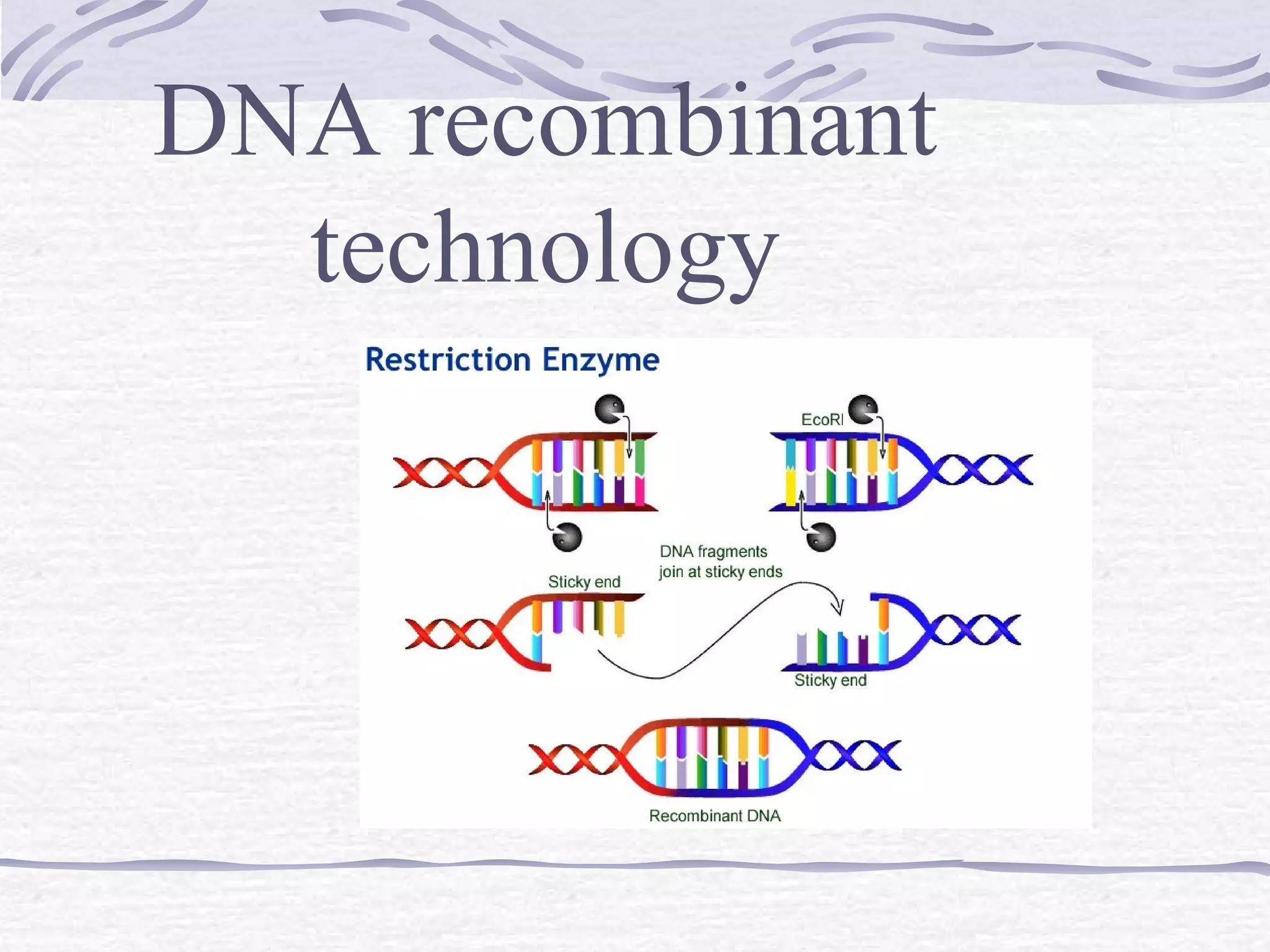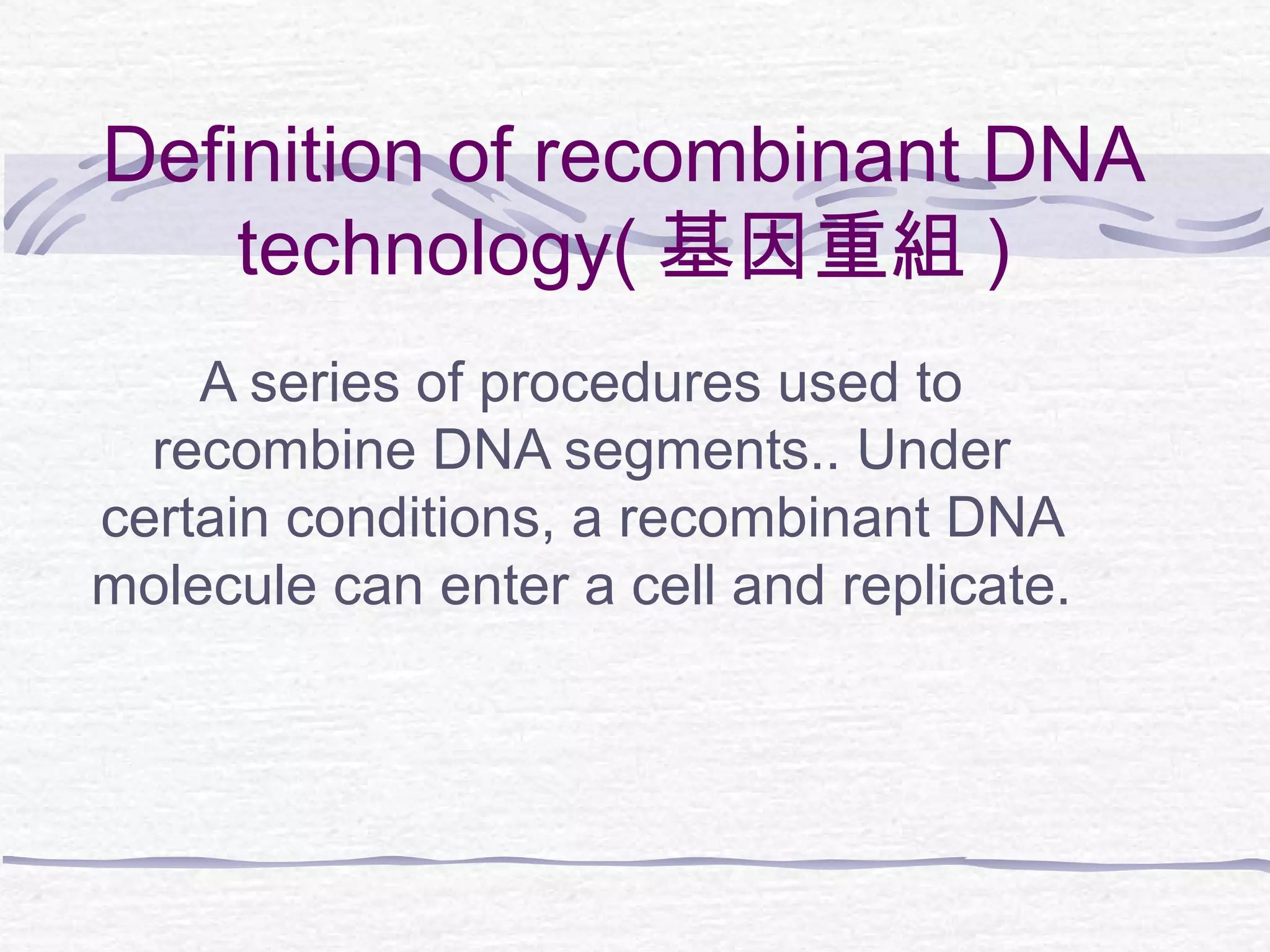 Recombinant DNA technology involves recombining DNA segments and allowing recombinant DNA molecules to enter cells and replicate. It was developed in 1973 by scientists Boyer and Cohen. The basic principle is to insert DNA into a vector, introduce it into a host cell where it replicates and produces the gene. Applications include producing human proteins like insulin through genetically engineered bacteria. Safety issues involve ensuring recombinant bacteria do not escape the laboratory and cause epidemics, which is addressed through physical and biological containment methods overseen by regulatory committees.