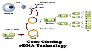 Recombinant DNA (r-DNA) technology, also known as genetic engineering, involves manipulating genetic material in vitro by cutting DNA into fragments and introducing them into host cells to alter phenotypes. There are three main tools used: enzymes, vector/vehicle DNA, and passenger DNA. Enzymes like endonucleases and ligases are used to cut and join DNA fragments. Vectors like plasmids are used to transfer passenger DNA, which can be cDNA, synthetic DNA, or random DNA fragments, into host cells. The goal is to alter organisms by genes or DNA sequences from other sources to suit human needs.