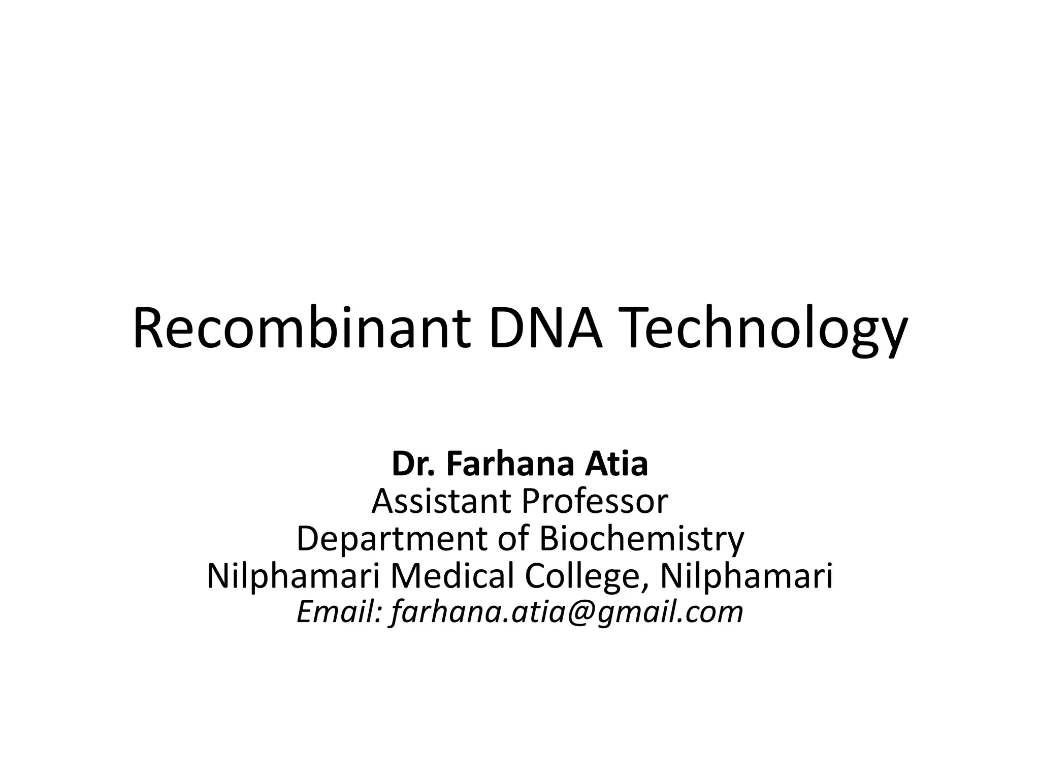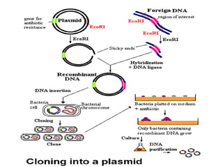 1. Recombinant DNA technology involves manipulating genetic material from different sources to create chimeric DNA molecules. This is done using various tools like restriction enzymes, DNA ligase, cloning, and gene transfer methods.