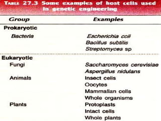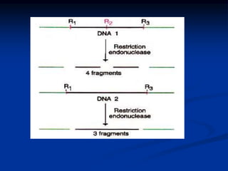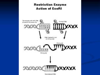 The document discusses recombinant DNA technology. It begins by explaining that recombinant DNA is formed by joining DNA molecules or fragments from different sources. This technology has proven valuable in medicine, agriculture, industry and more. Key techniques discussed include using restriction enzymes to cut DNA at specific sequences, generating sticky or blunt ends, and joining DNA fragments together with DNA ligase to form recombinant DNA. The document also summarizes cloning recombinant DNA in bacteria using vectors like plasmids or cloning in eukaryotic cells using yeast artificial chromosomes. It describes amplification of DNA by cloning in cells or by polymerase chain reaction (PCR).