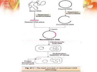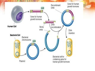Recombinant DNA technology involves manipulating DNA from different sources to produce novel DNA molecules. It has several key steps: isolating the desired DNA and vector, joining them using enzymes to create recombinant DNA, introducing this into a host cell, and selecting cells that express the gene. This technology has many applications including producing human insulin and growth hormones through bacteria, developing vaccines by cloning genes for antigens, and creating monoclonal antibodies. It allows mass production of important biological substances that were previously difficult to obtain.