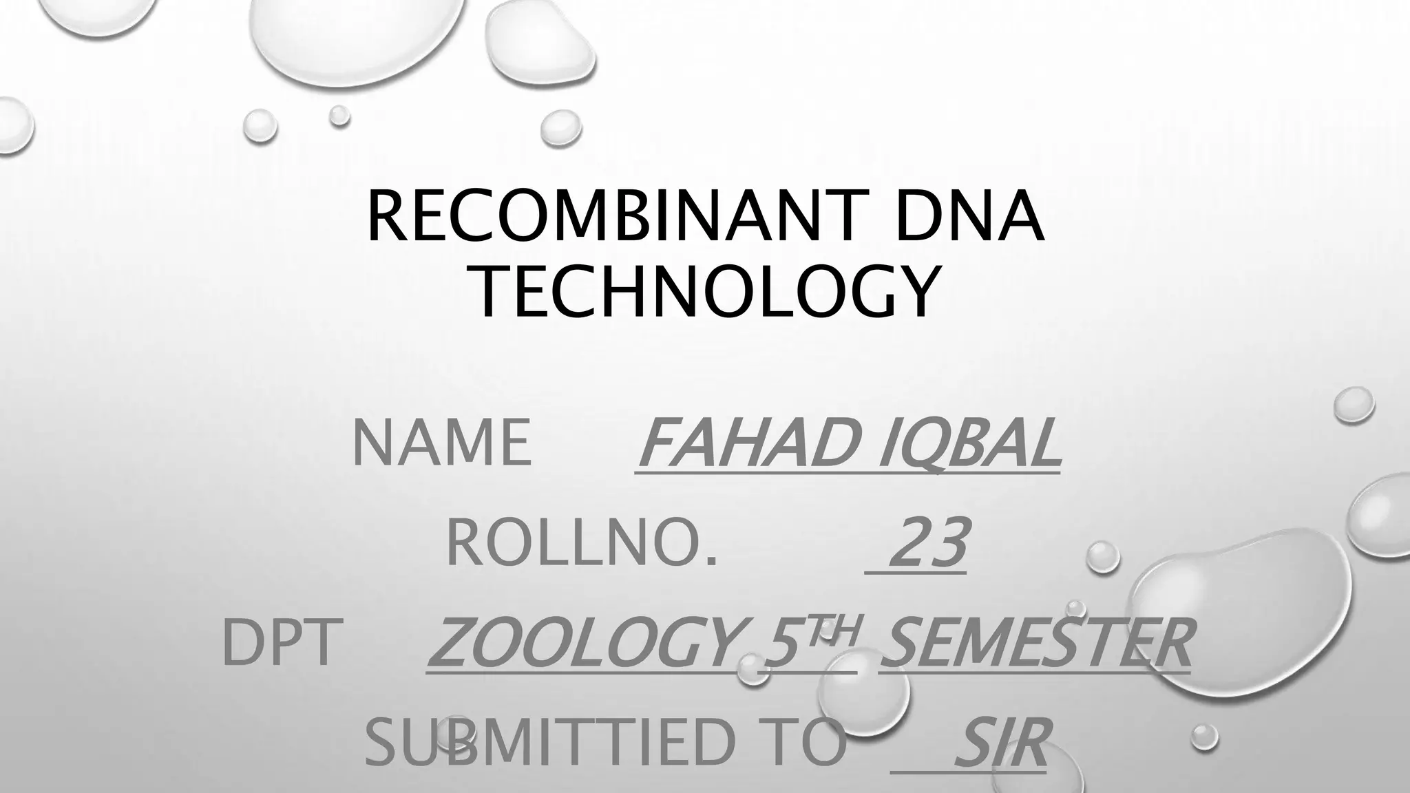 Recombinant DNA technology is the subject of the document. The document was submitted by Fahad Iqbal, a 5th semester zoology student with roll number 23, to their professor.