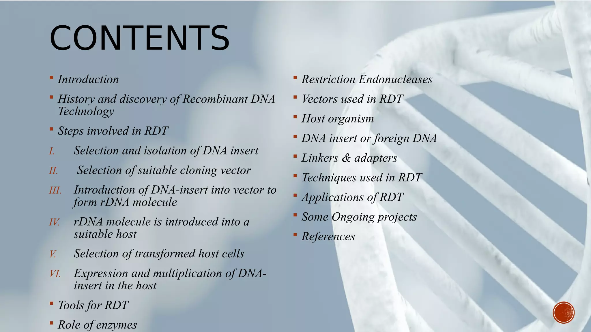 This document provides an overview of recombinant DNA technology (RDT). It discusses the history and discovery of RDT, the key steps involved which include selecting DNA inserts and vectors, introducing the DNA into host cells, and expressing the DNA. Important tools for RDT are described, including restriction enzymes, vectors, and host organisms. Common applications of RDT include producing hormones, medicines, transgenic plants and animals. Ongoing projects utilizing RDT are mentioned.