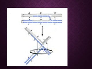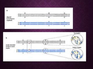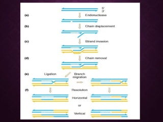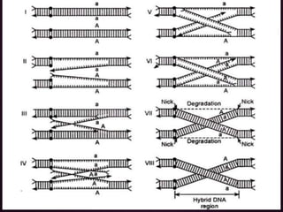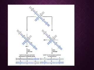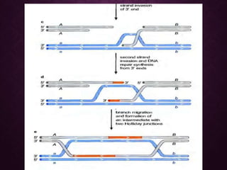 This document discusses molecular genetics topics including sex determination, genetic recombination, and transposons. It outlines four units of study: 1) Sex determination and dosage compensation, 2) Genetic recombination mechanisms and models, 3) Enzymes involved in homologous and site-specific recombination, and 4) Bacterial and eukaryotic transposons. The second section provides detailed descriptions of homologous recombination models including Holliday, Whitehouse, Meselson-Radding, and double-strand break repair pathways. Key enzymes in E. coli recombination such as RecBCD, RecA, RuvAB, and RuvC are also summarized.