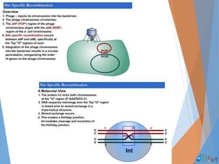 Genetic recombination involves the breaking and rejoining of DNA to form new combinations of genes. It occurs primarily during meiosis through several types of recombination, including homologous recombination where DNA exchanges occur between similar DNA molecules. This increases genetic diversity and allows for traits to be mixed. Recombination benefits populations by generating variety among offspring and allowing deleterious genes to be removed without losing the entire chromosome. It has applications in cloning, mapping genes, and making transgenic organisms.