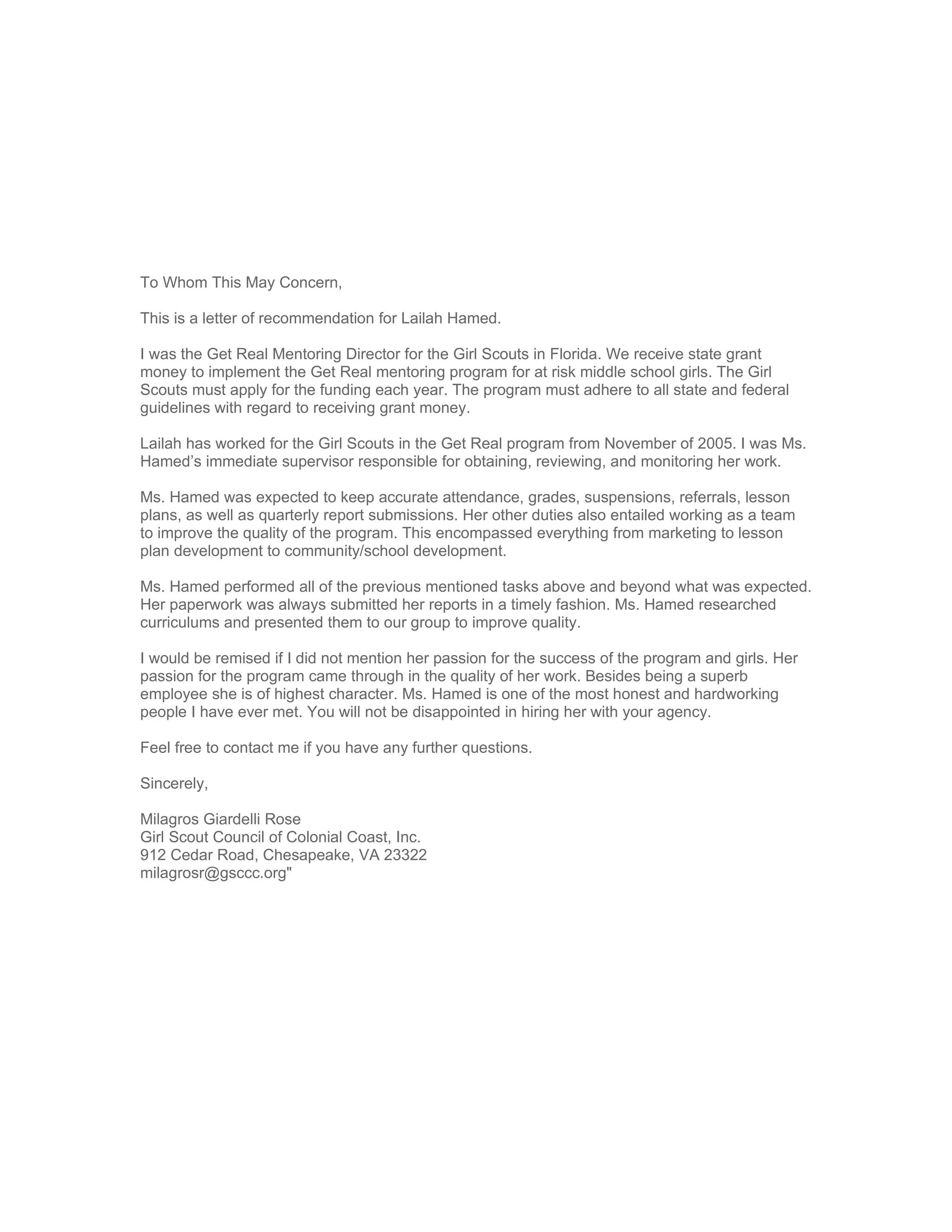 This letter is a recommendation for Lailah Hamed for her work with the Girl Scouts' Get Real mentoring program in Florida from 2005-present. As the program director, the author oversaw Lailah in keeping accurate records, submitting timely reports, developing lesson plans and curriculums, and improving the overall quality of the program through marketing and community engagement. The author highly praises Lailah's passion, work ethic, honesty and success in her role.