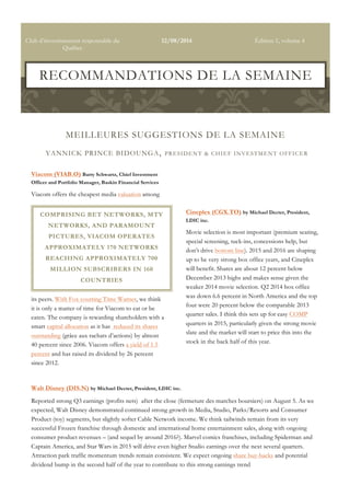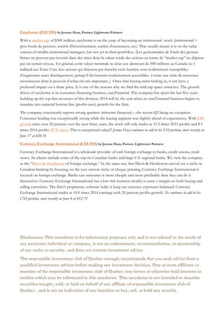 Viacom offers the cheapest media valuation among its peers and has rewarded shareholders through stock buybacks and dividend increases. Cineplex shares are below 2013 highs but strong upcoming films will likely drive earnings growth. Disney reported strong earnings from media, studios, parks and consumer products, and upcoming Marvel and Star Wars films will sustain growth. Easyhome is on the verge of becoming an institutional holding which could boost its share price significantly, while its consumer financing business will drive profits growth. Currency Exchange International has a low-risk business providing foreign exchange to banks and trades at a reasonable valuation with profits growth.