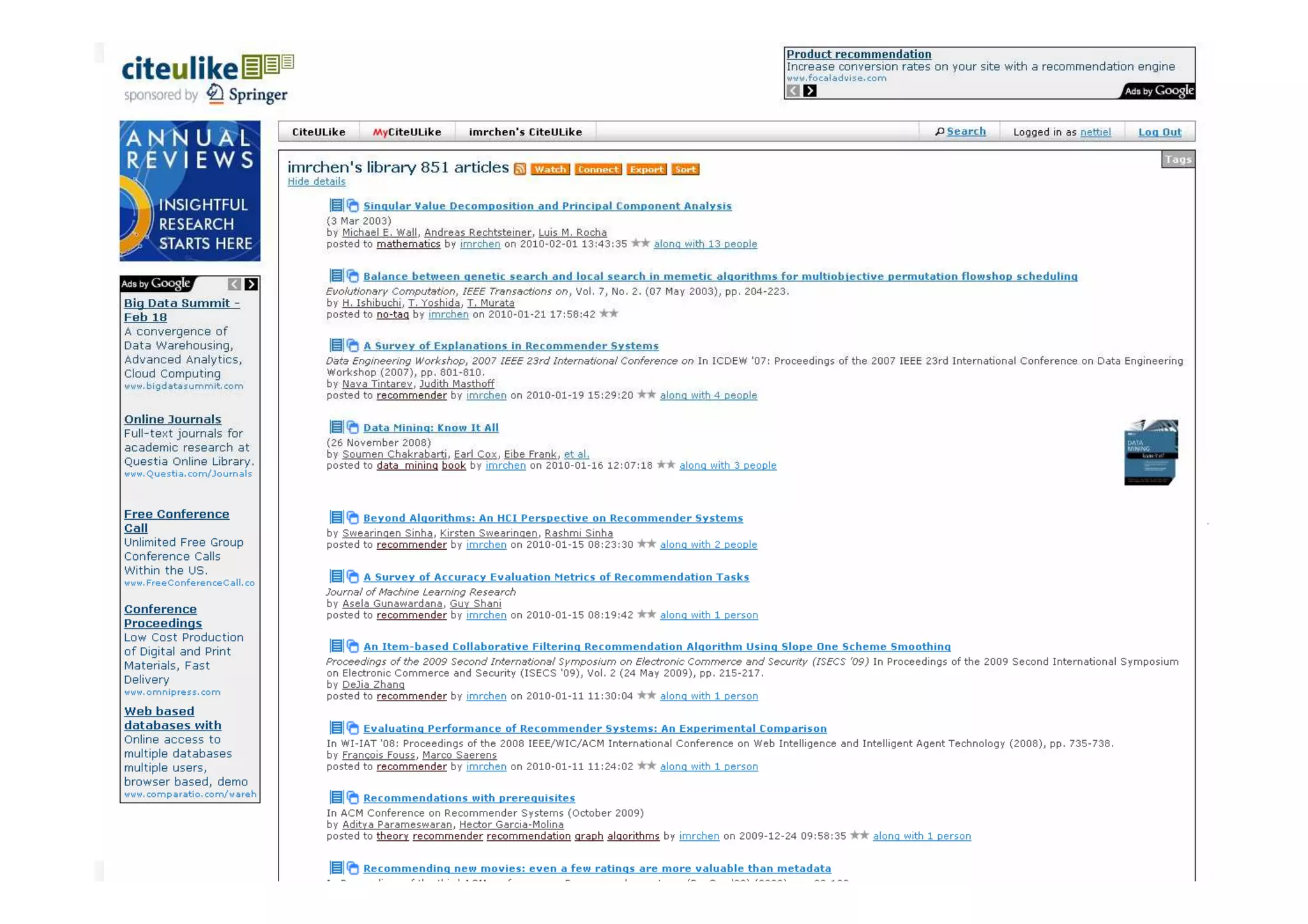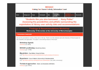The document discusses the implications of recommender systems in scholarly communication, particularly focusing on how user-generated content and usage data can enhance information discovery. It emphasizes the need for recommender services that concentrate on scholarly materials, utilizing data mining techniques to generate relevant recommendations based on user activity. Additionally, it highlights the benefits and growing importance of these systems in managing information overload and facilitating user engagement in research.