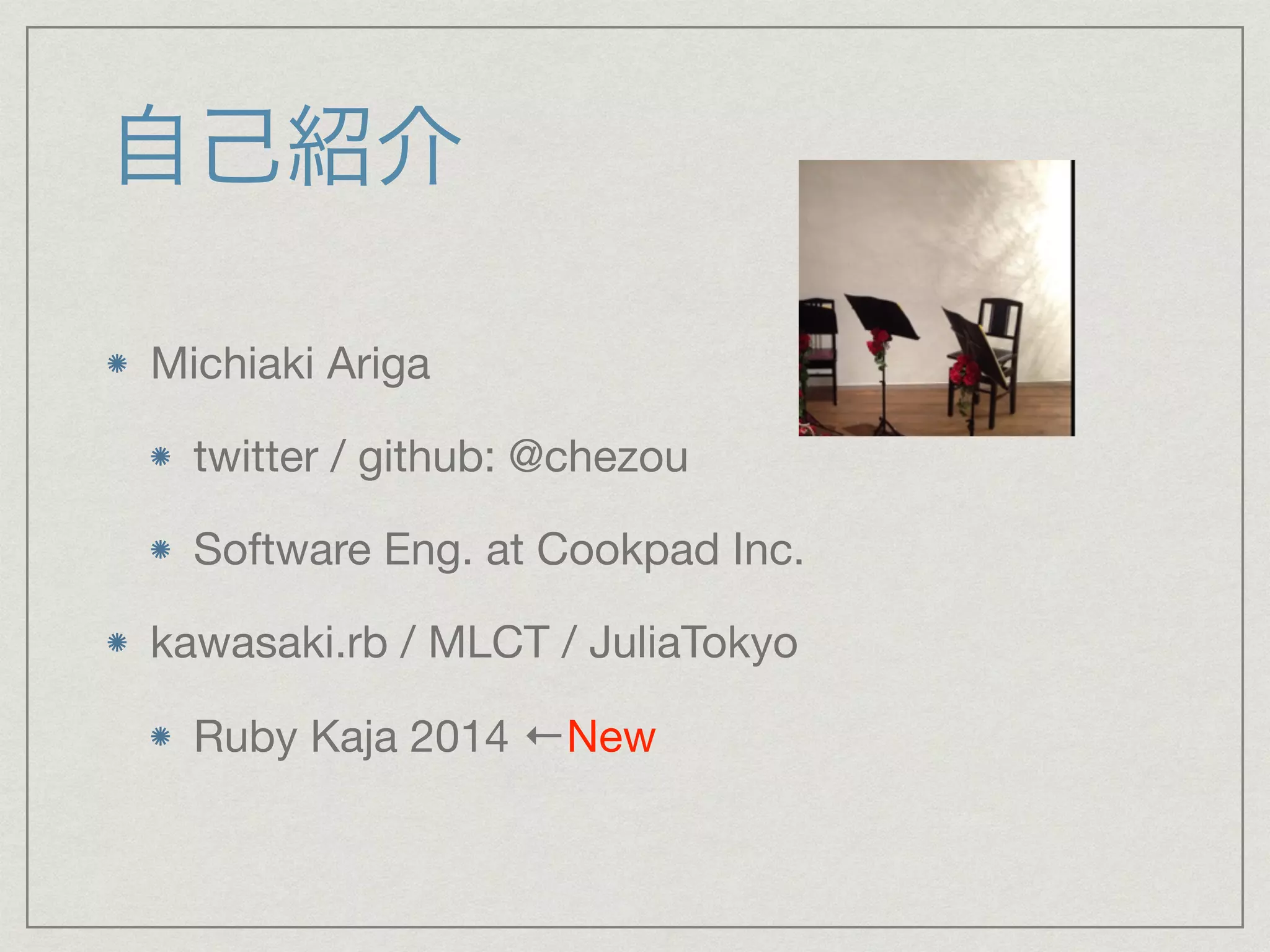 twitter / github: @chezou Software Eng. at Cookpad Inc. kawasaki.rb / MLCT / JuliaTokyo Ruby Kaja 2014 ←New