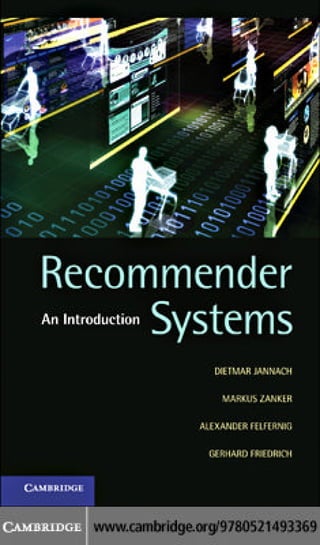 This document provides an introduction to recommender systems. Recommender systems aim to provide personalized recommendations to help users make decisions by automating strategies for filtering information. The book covers collaborative, content-based, knowledge-based, and hybrid recommendation approaches as well as explanations, evaluations, and applications of recommender systems. It is intended to provide an overview of the field for researchers and professionals.
