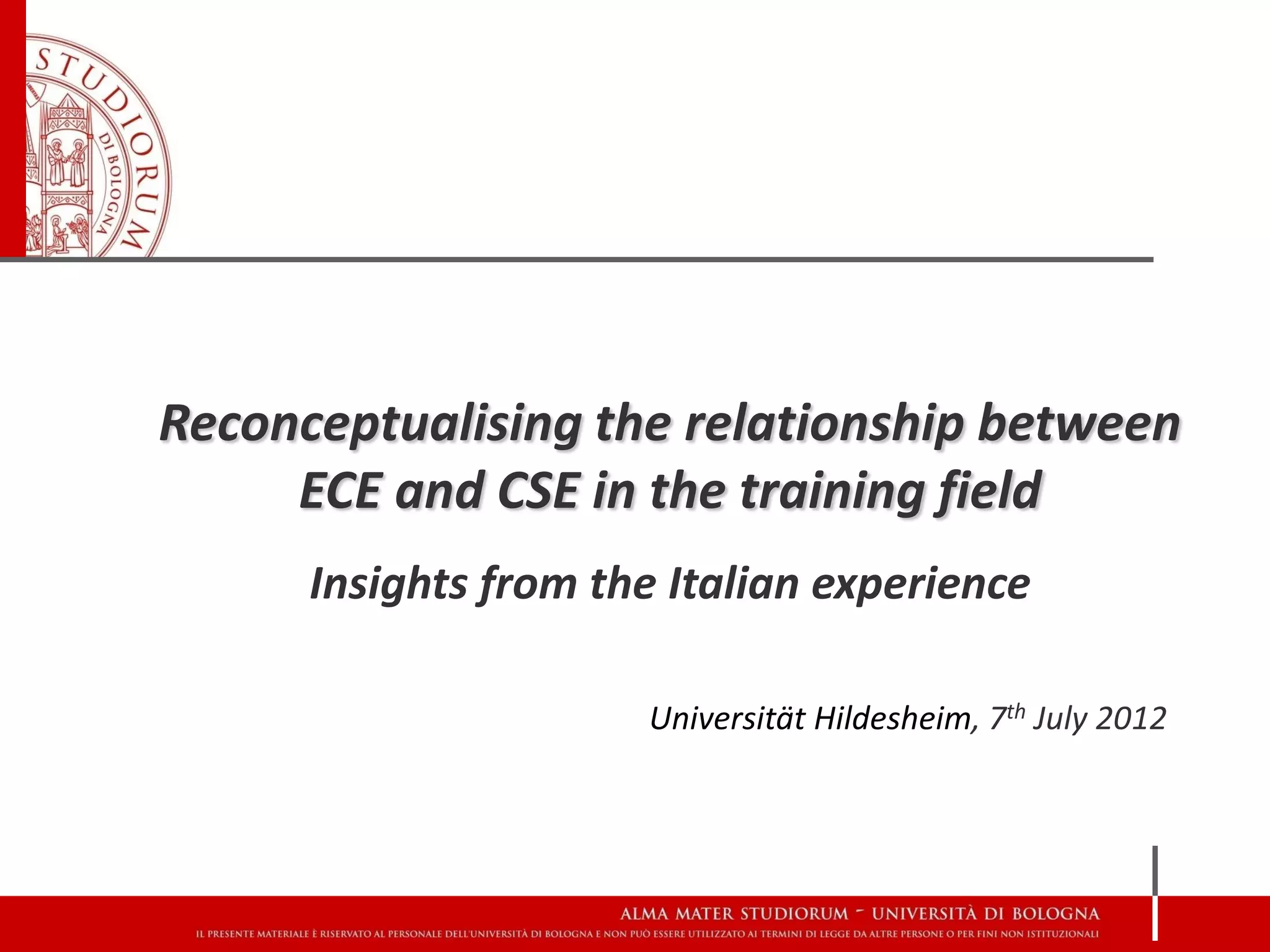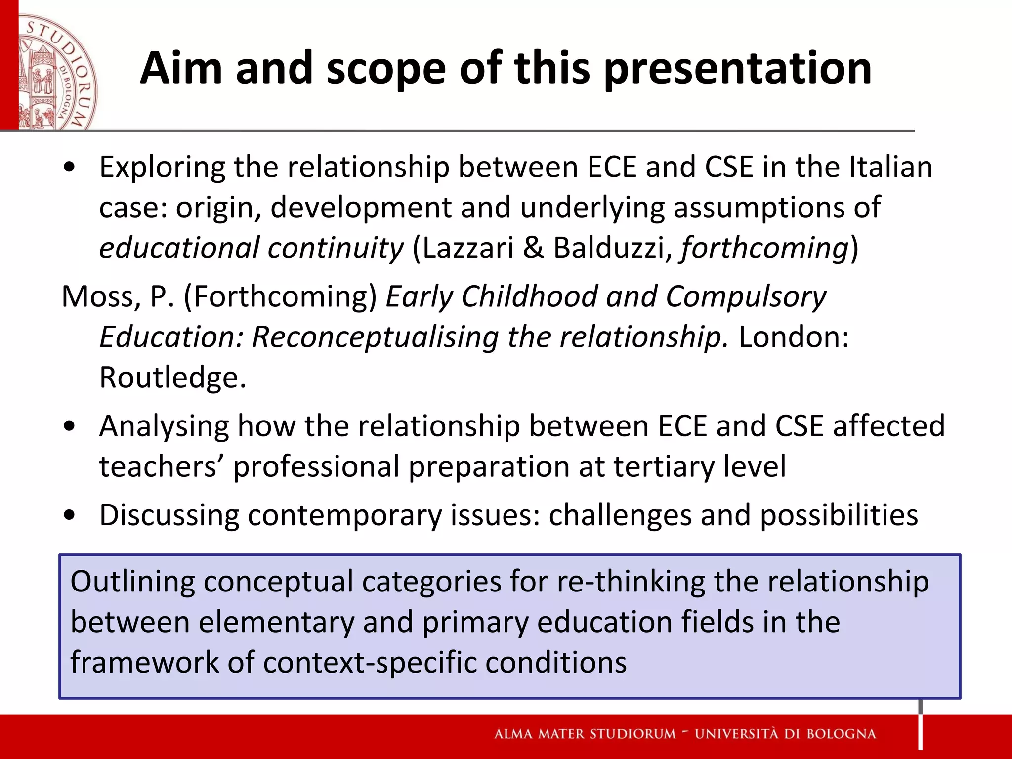This document discusses the relationship between early childhood education (ECE) and compulsory school education (CSE) in Italy. It explores how the concept of "educational continuity" has shaped the relationship and influenced teacher training. Key points include: