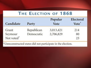 The document discusses different plans and phases of Reconstruction after the U.S. Civil War, including Lincoln's 10% Plan, the Radical Plan requiring black suffrage, and Presidential Reconstruction under Andrew Johnson. It also outlines the passage of the 13th and 14th Amendments, the imposition of Black Codes, and Congress' increasing conflict with President Johnson as Northern alarm over his lenient treatment of the South grew. Finally, it describes the Republican gains in the 1866 election and Congress' Radical Plan asserting control over Reconstruction through the military and requiring new Southern state constitutions.