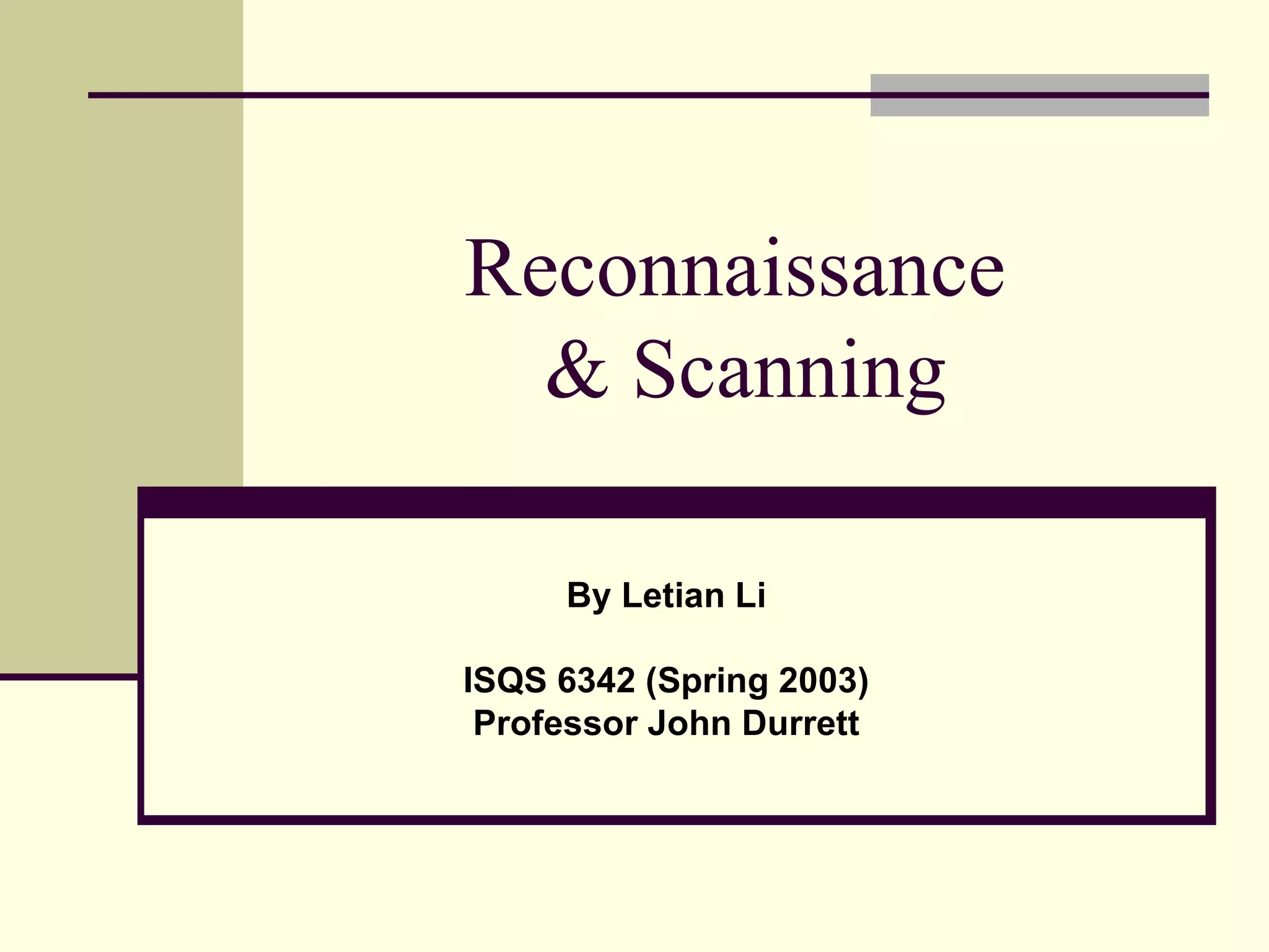 The document discusses various techniques for reconnaissance, including searching public information on the internet, using tools to scan for open systems and services, and ways to map out network configurations. It provides details on low-tech methods like searching websites, Whois databases and DNS, as well as technical scanning tools to discover active systems, network topology, and open ports. The document also offers defenses against some of these reconnaissance techniques.