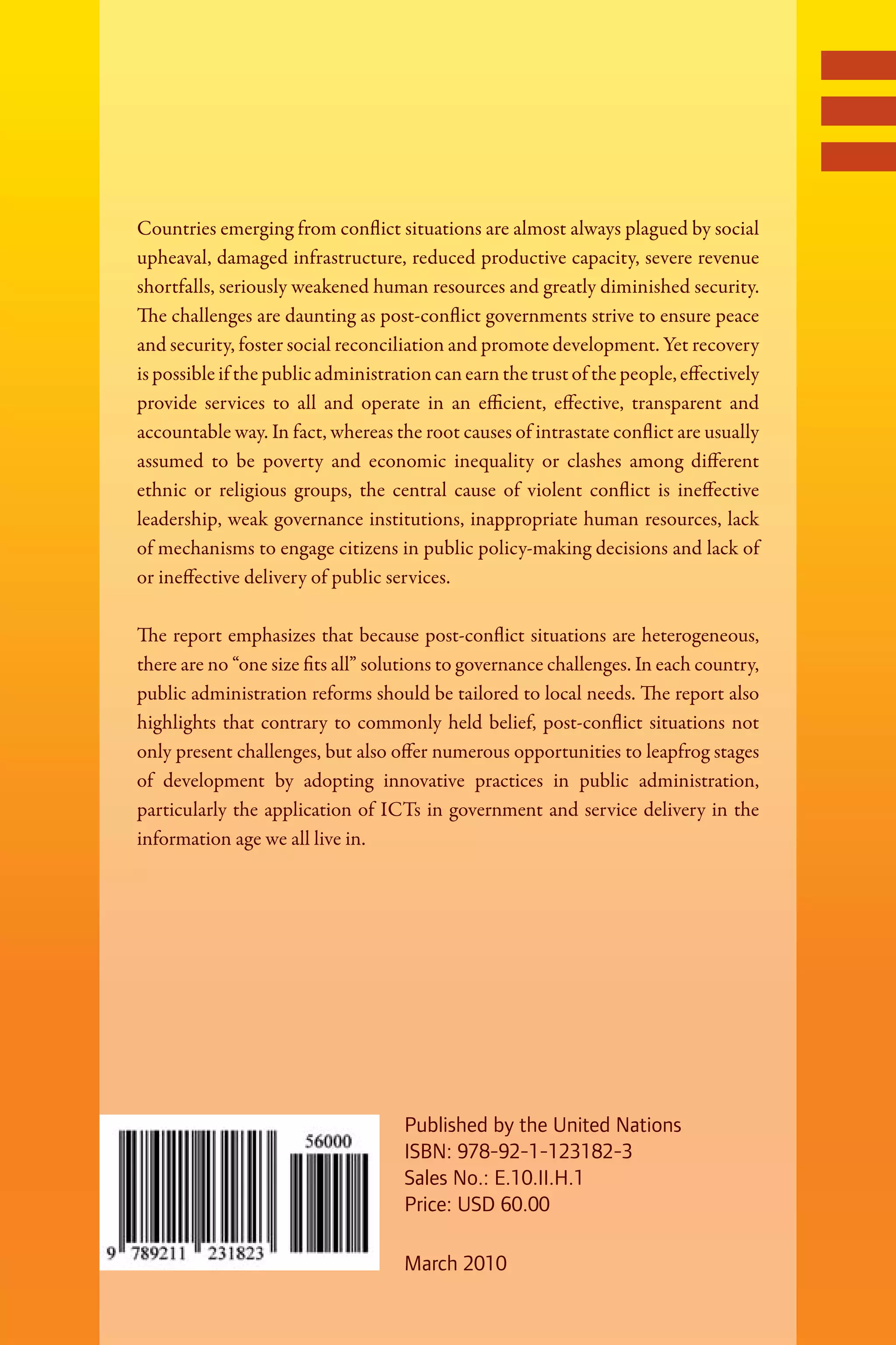 The document discusses the challenges and opportunities faced by countries emerging from conflict, emphasizing the need for effective public administration to promote peace and development. It highlights that rebuilding governance must be tailored to local needs rather than a one-size-fits-all approach, focusing on earning public trust and engaging citizens in decision-making. Additionally, innovative practices in public administration present opportunities for rapid development, particularly through the use of information and communication technologies.