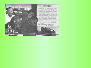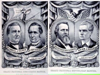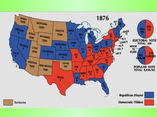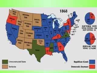 Reconstruction (1865-1877) aimed to rebuild the South after the Civil War and restore Southern states to the Union. It involved several plans and acts by Lincoln, Johnson, and Congress to repair infrastructure, establish the Freedmen's Bureau to aid former slaves, and define citizenship and voting rights through amendments to the Constitution. However, the withdrawal of federal troops from the South in 1877 after the Compromise effectively ended Congressional Reconstruction and left black southerners vulnerable to violence and intimidation through organizations like the Ku Klux Klan and oppressive policies like black codes and sharecropping.
