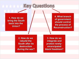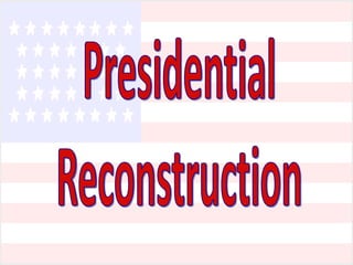 President Lincoln's Reconstruction plans focused on quick readmission of Southern states once 10% of voters swore loyalty oaths. Congress opposed this lenient approach and passed the stricter Wade-Davis Bill, which Lincoln pocket vetoed. Andrew Johnson largely continued Lincoln's conciliatory policies, pardoning ex-Confederates and allowing them to regain power. This outraged Republicans and led to increased protections for freedmen in the Civil Rights Act of 1866 and the 14th Amendment. Ultimately, the Radical Republican plan implemented by Congress through military occupation and enforcement acts was deemed most effective at reconstructing the South and protecting freedmen, though its goals were only partially achieved and enforcement broke down.