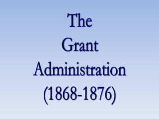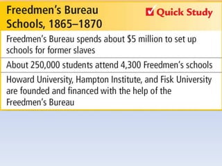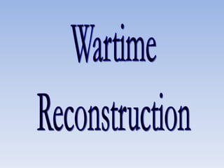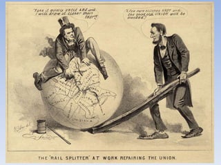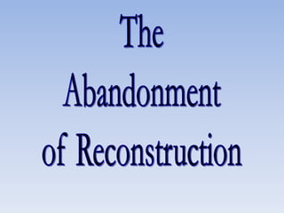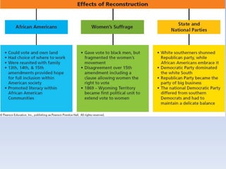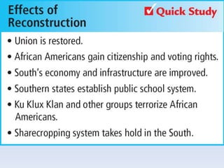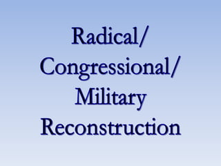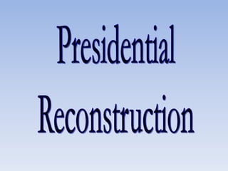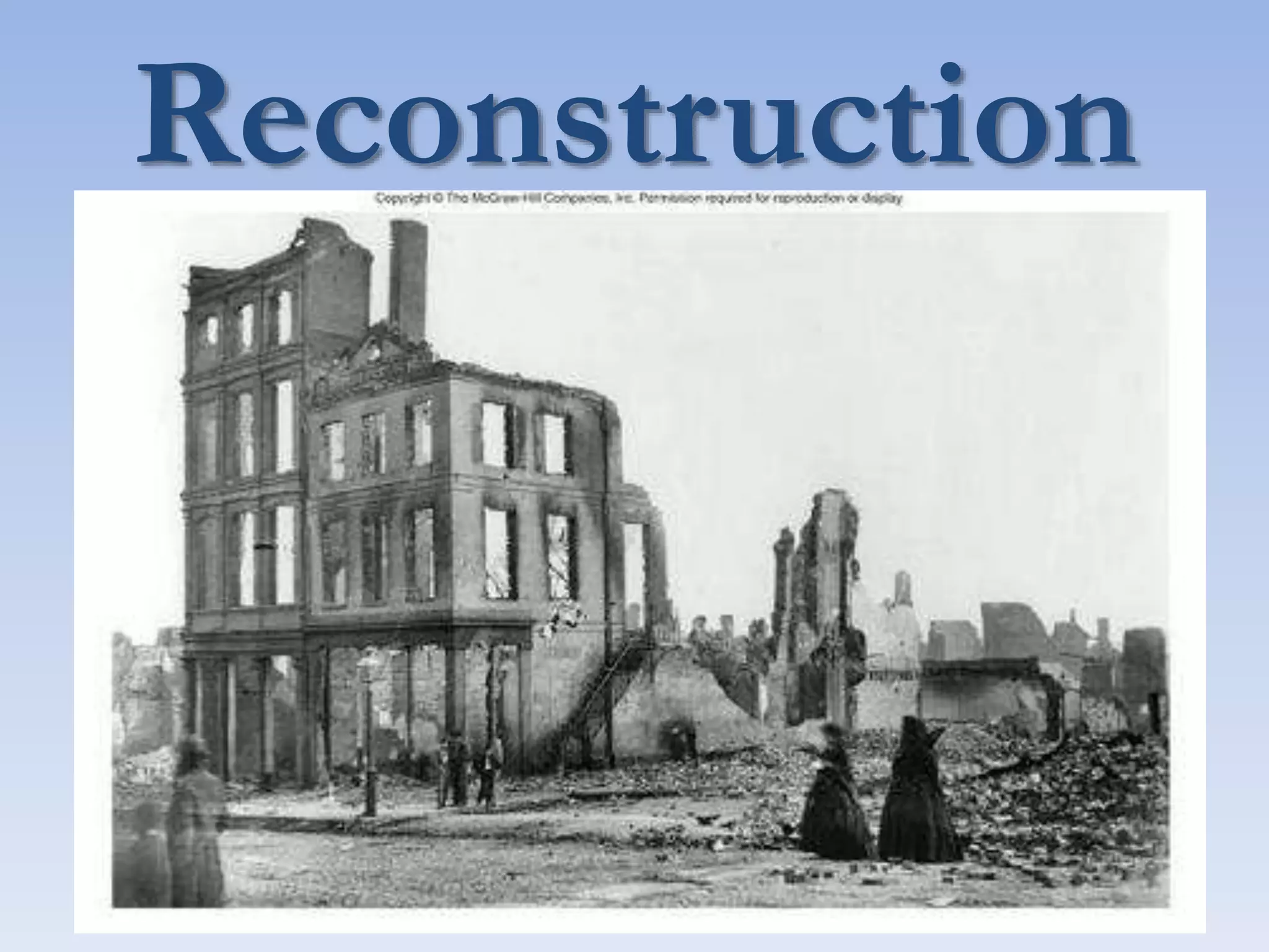 Reconstruction aimed to reunite the nation after the Civil War by bringing the Confederate states back into the Union, rebuilding the South, and protecting the rights of freed black people. There were differing views on how to achieve this, ranging from Lincoln's lenient 10% Plan to the Radical Republican desire to treat the South as conquered territory and empower freedmen. Ultimately, the North grew weary and compromise in 1877 restored home rule to the white South, effectively ending Congressional Reconstruction and protections for black civil rights.