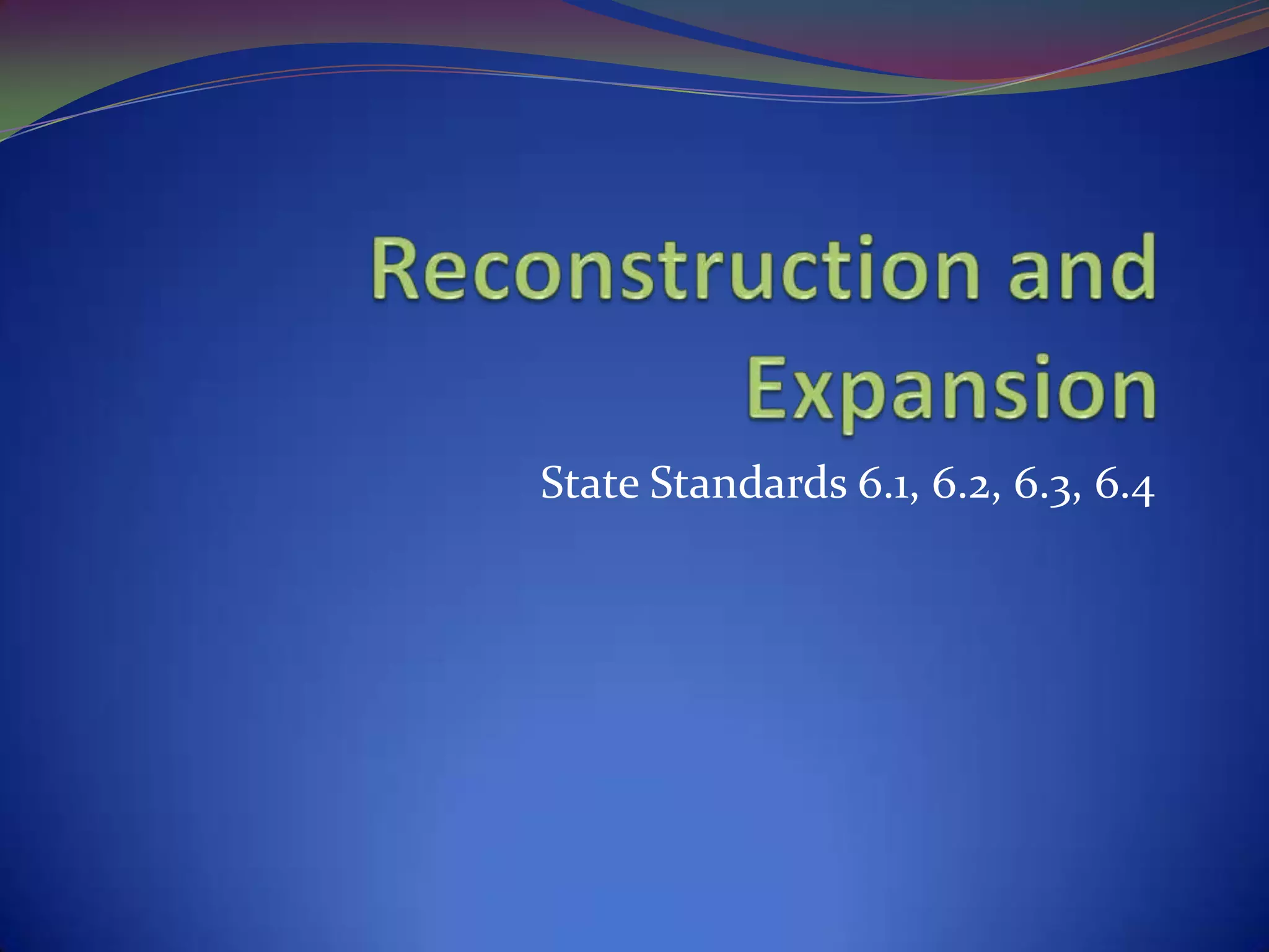 During Reconstruction after the Civil War, there was debate around how to treat the defeated South. Radical Republicans favored harsh policies like slow readmission to the Union and maintaining troops in the South. President Andrew Johnson wanted more lenient treatment like what Lincoln supported, with generosity towards the South. However, Johnson's dismissal of Congress led to impeachment proceedings. By 1877, Northern troops withdrew from the South and local governments regained control, enacting segregationist laws.