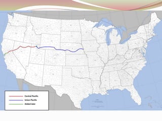 Westward expansion was spurred by mining for gold and silver, cattle ranching on the open range, and farming enabled by the Homestead Act. The Transcontinental Railroad, completed in 1869, connected the country and facilitated westward migration and transport of goods using
