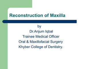 This document summarizes reconstruction of the maxilla following maxillectomy. It describes the anatomy and goals of maxillary reconstruction. Maxillectomy defects are classified and reconstruction options are outlined, including prosthetic obturators, local and regional pedicled flaps, microvascular free flaps, bone grafts, and titanium mesh. Defect-specific reconstruction approaches are provided for different types of maxillectomy defects, such as palate defects, inferior maxillectomies, total maxillectomies with and without orbital exenteration, and orbitomaxillectomies.