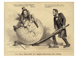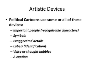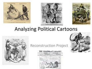 This document provides guidance on analyzing political cartoons from the Reconstruction era following the U.S. Civil War. It identifies the common artistic devices used in political cartoons, such as important people, symbols, exaggerated details, labels, thought bubbles, and captions. It then explains specific symbols used in a cartoon depicting Abraham Lincoln and Andrew Johnson repairing the country - Lincoln is shown as a rail splitter, representing his early career, while Johnson is depicted as a tailor, also referring to his early career. The thread symbolizes the reconstruction programs. Finally, it states that political cartoons are primary sources that provide insight into the time period depicted.