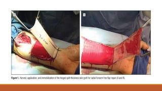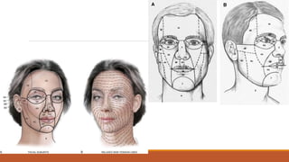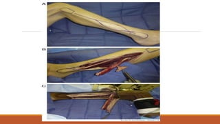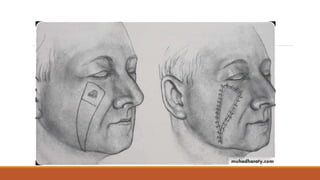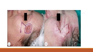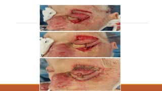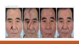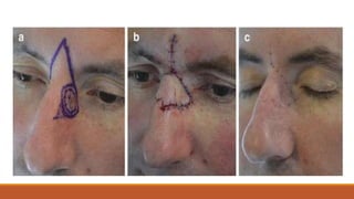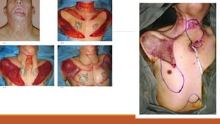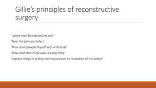 This document provides an overview of reconstruction techniques in head and neck surgery. It discusses Gillie's principles of reconstruction and the reconstructive ladder. It describes various techniques including skin grafts, local flaps such as nasolabial and forehead flaps, distant flaps such as deltopectoral and latissimus dorsi flaps, and free tissue transfers including radial forearm and fibula flaps. It discusses factors to consider for each technique such as blood supply, advantages, disadvantages and appropriate applications in head and neck reconstruction.