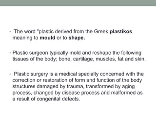 Plastic surgery, a medical specialty focused on restoring form and function, encompasses reconstructive and cosmetic procedures, often involving skin grafting. Reconstructive surgery aims to correct functional impairments from trauma or congenital defects, while cosmetic surgery focuses on enhancing aesthetic appearance. Key principles include minimizing scarring and ensuring proper healing, with careful post-operative care being crucial for successful outcomes.