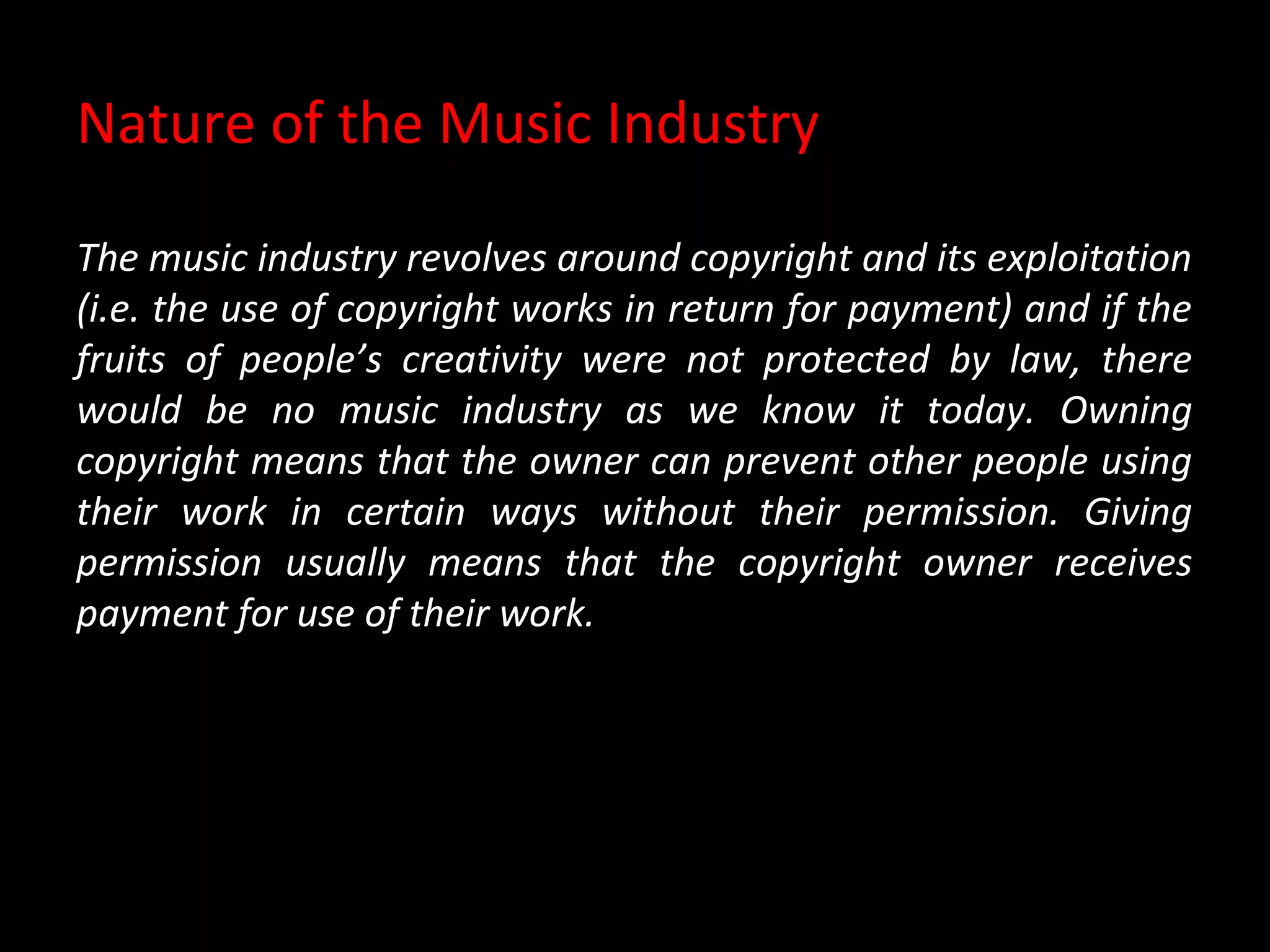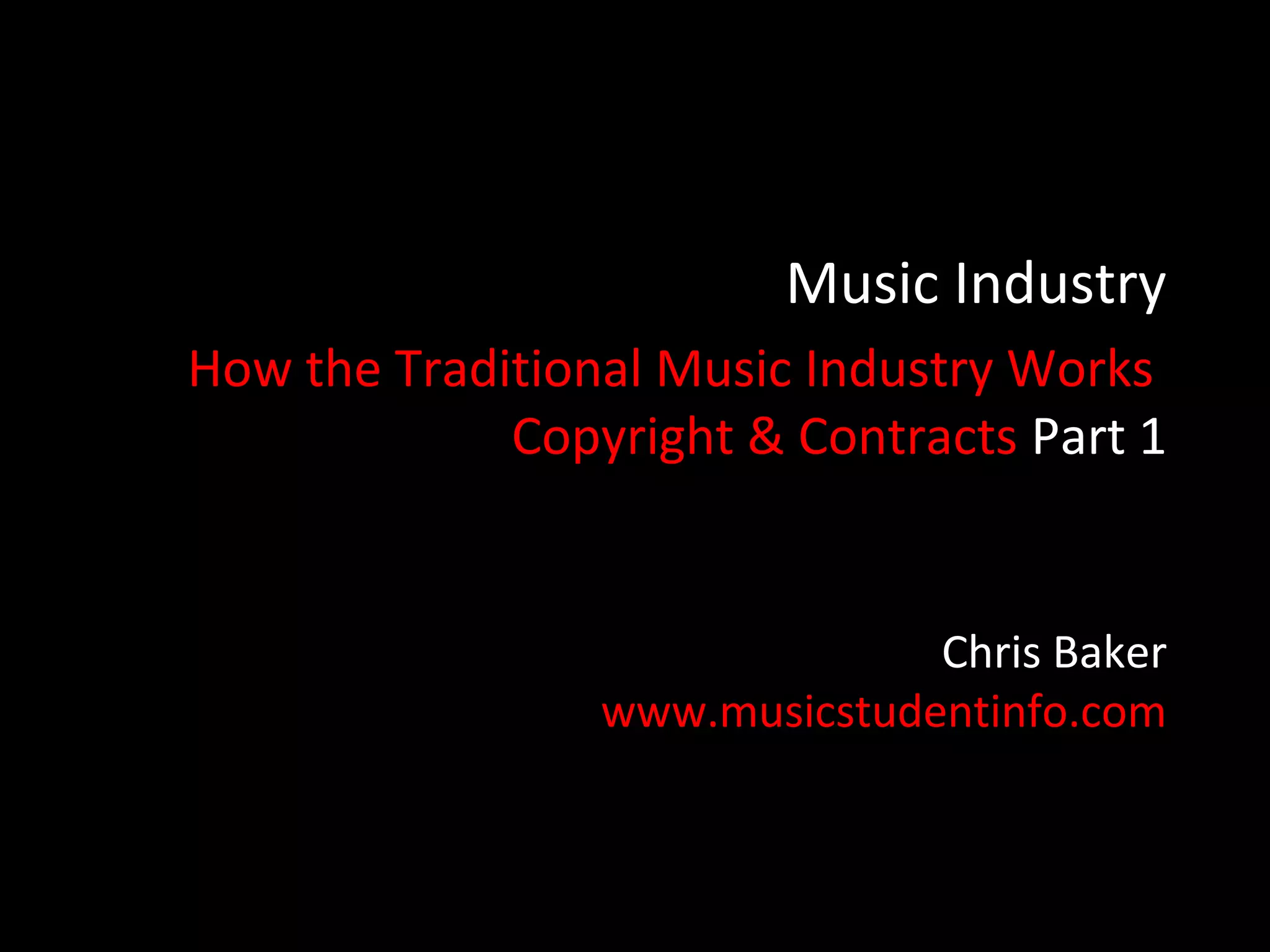 The document provides an overview of how copyright and contracts work in the traditional music industry. It discusses that copyright automatically exists as soon as a work is created in a fixed form. There are several restricted acts like copying, distributing, and broadcasting that copyright owners can prevent without permission. Record contracts are usually exclusive, requiring artists to only record for that label. Advances are paid upfront but must be recouped from royalties, which are a percentage of sales after deductions. Overall the document gives a high-level introduction to key copyright and contractual aspects of the music industry.