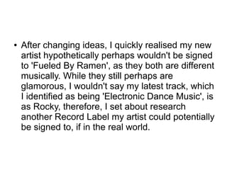 - The document discusses researching potential record labels for a hypothetical new electronic dance music artist.