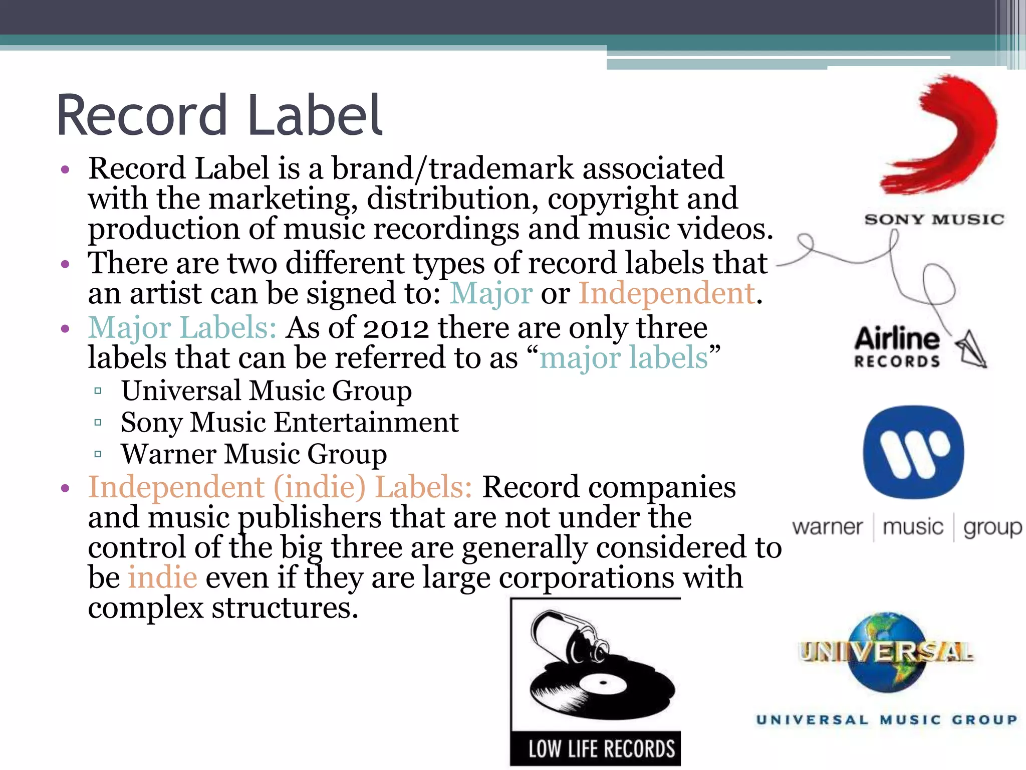 This document discusses record labels, copyright, and choosing an appropriate label for a new artist. It notes that there are major and independent labels, and recommends an independent label like VP Records for a new artist entering a genre they specialize in, like reggae, dancehall, or soca. Copyright gives artists and producers authority over how their musical works are used and exploited. When using copyrighted music in one's own videos, proper attribution showing one does not own the song is required.