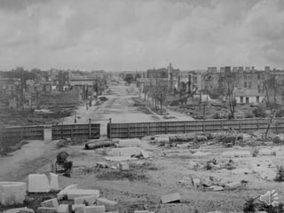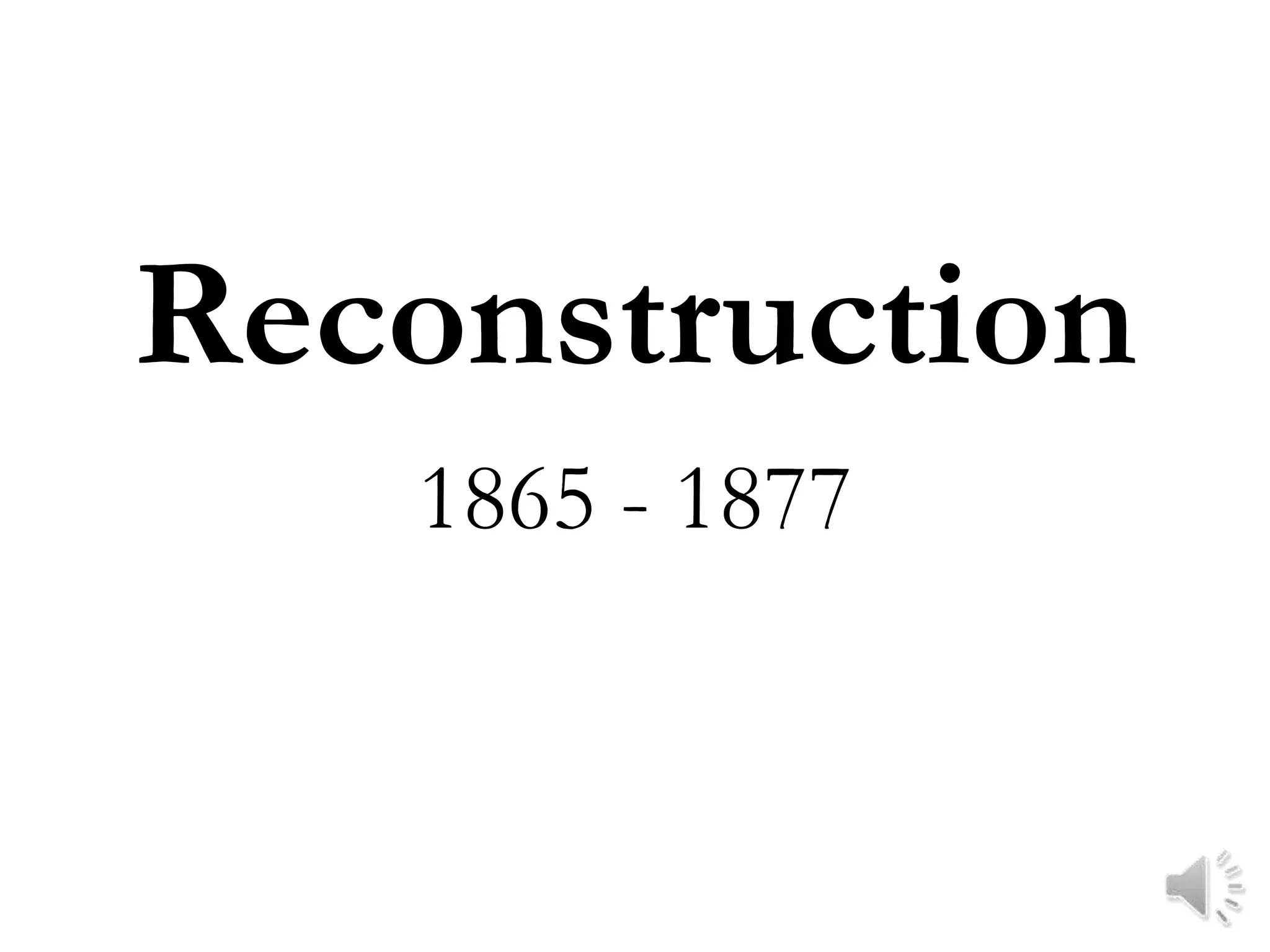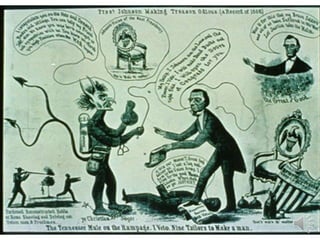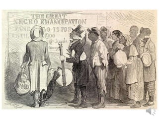 The document summarizes Reconstruction in the United States from 1865 to 1877 following the Civil War. It describes the tensions between Presidential and Congressional Reconstruction over how to reunite the country and integrate freed slaves. Key events included the 13th, 14th, and 15th Amendments abolishing slavery and granting citizenship and voting rights to black men, as well as the rise of Jim Crow laws and the Ku Klux Klan restricting those new rights in the South. Reconstruction ultimately ended in 1877 with the Compromise that resolved the disputed 1876 presidential election in favor of Republicans.