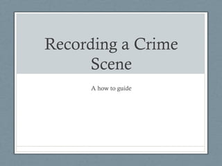 Recording a crime scene accurately is vital for presenting evidence in court. There are several methods for documenting a scene, including photography, computer drafts, and sketches. Photographs should show the entire scene and evidence in its original, unaltered state before anything is moved or collected. All details, measurements, and relative positions must be fully captured to establish the facts of the case.