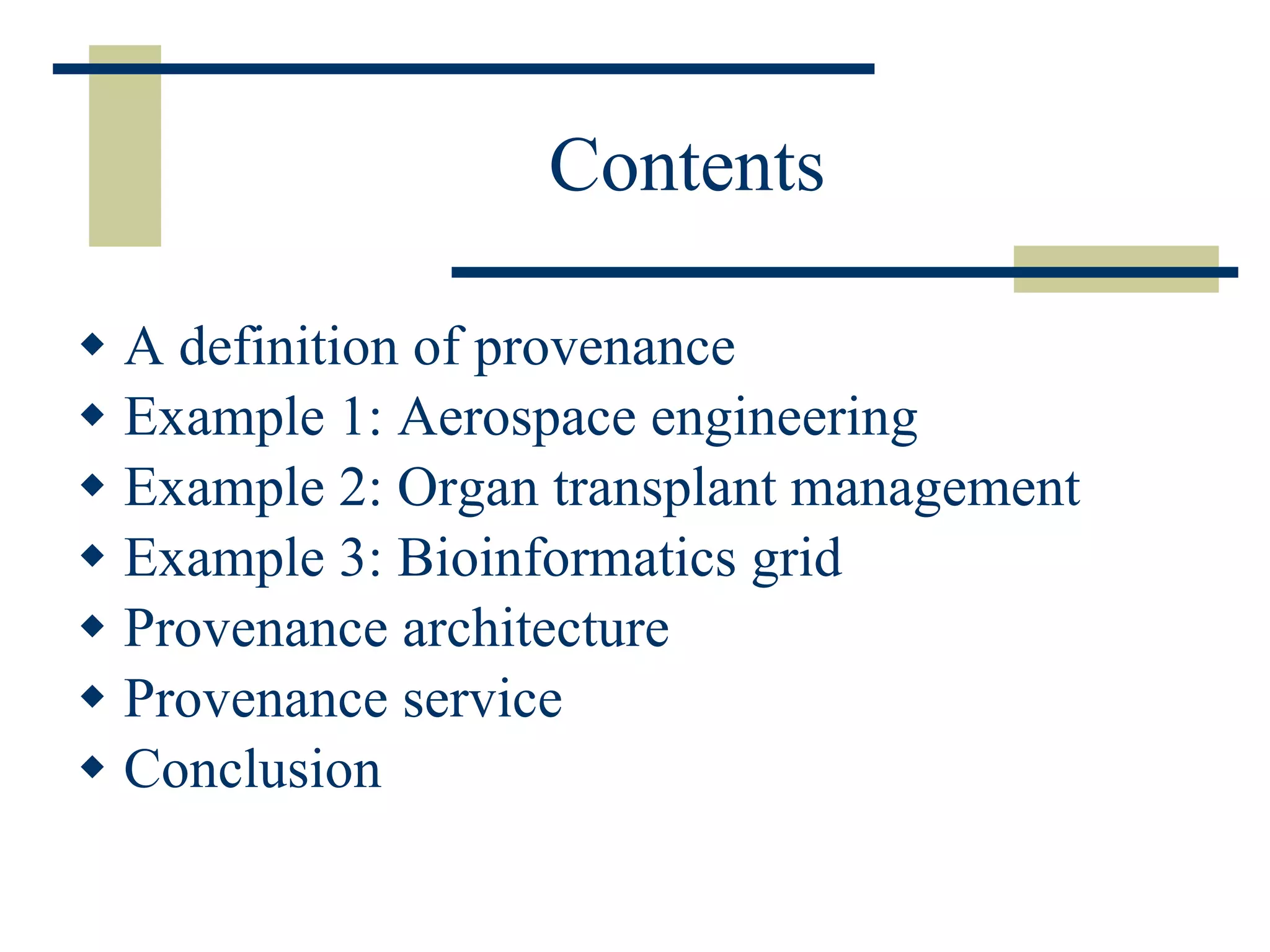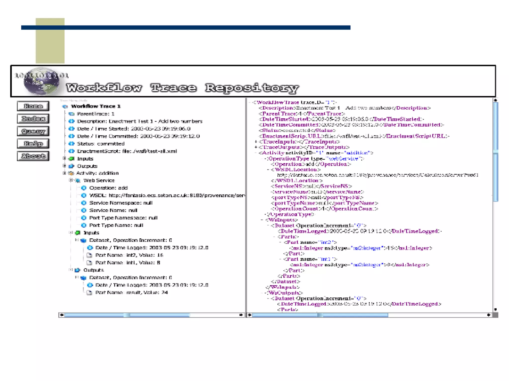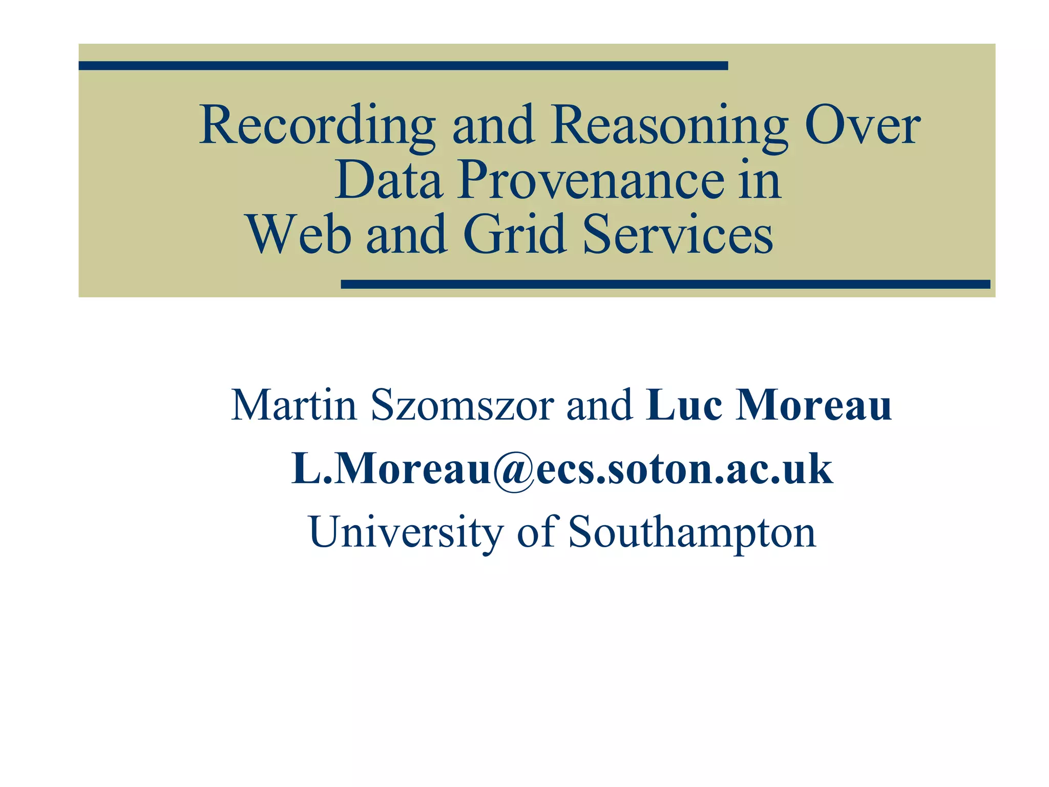 The document discusses the importance of provenance data in distributed computing environments like grids and web services. It proposes a service-oriented architecture and data model for capturing and querying provenance information. The architecture includes a provenance service for storage and analysis of provenance data gathered during workflow executions across multiple services and systems.