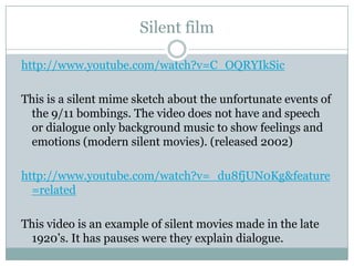 The document discusses the evolution of film recording technology over time. It begins with examples of silent films from the early 20th century that lacked sound or dialogue. Examples are then given of black and white films from the 1980s and early colored films. The document shows how modern technology and HD have improved film quality, with examples from 2010 and 2011. It outlines how photography and recording cameras were initially limited to visuals alone before sound was incorporated. The development culminated in HD cameras and 3D film which added realism.