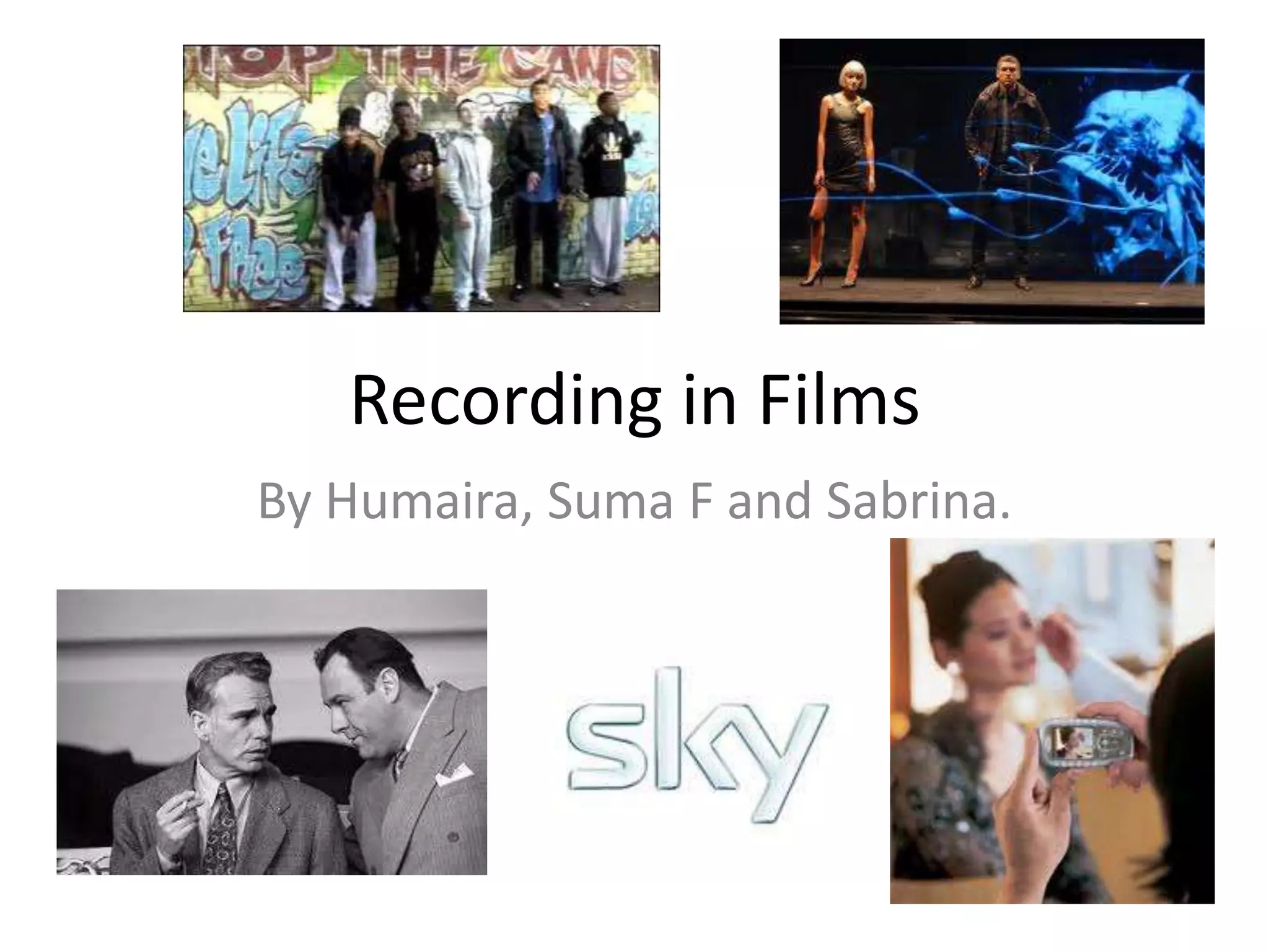 This document discusses the development of film recording technology over time. It begins with silent films from the early 20th century and examples of black and white and early colored films. It then covers how films can now be recorded on mobile phones and DVRs. Modern technology allows for animated films and HD quality. 3D and potential 4D and hologram technologies provide more realistic and immersive viewing experiences, with holograms creating projected images that can be viewed from different angles. Recording technology continues to advance, improving visual and audio quality.