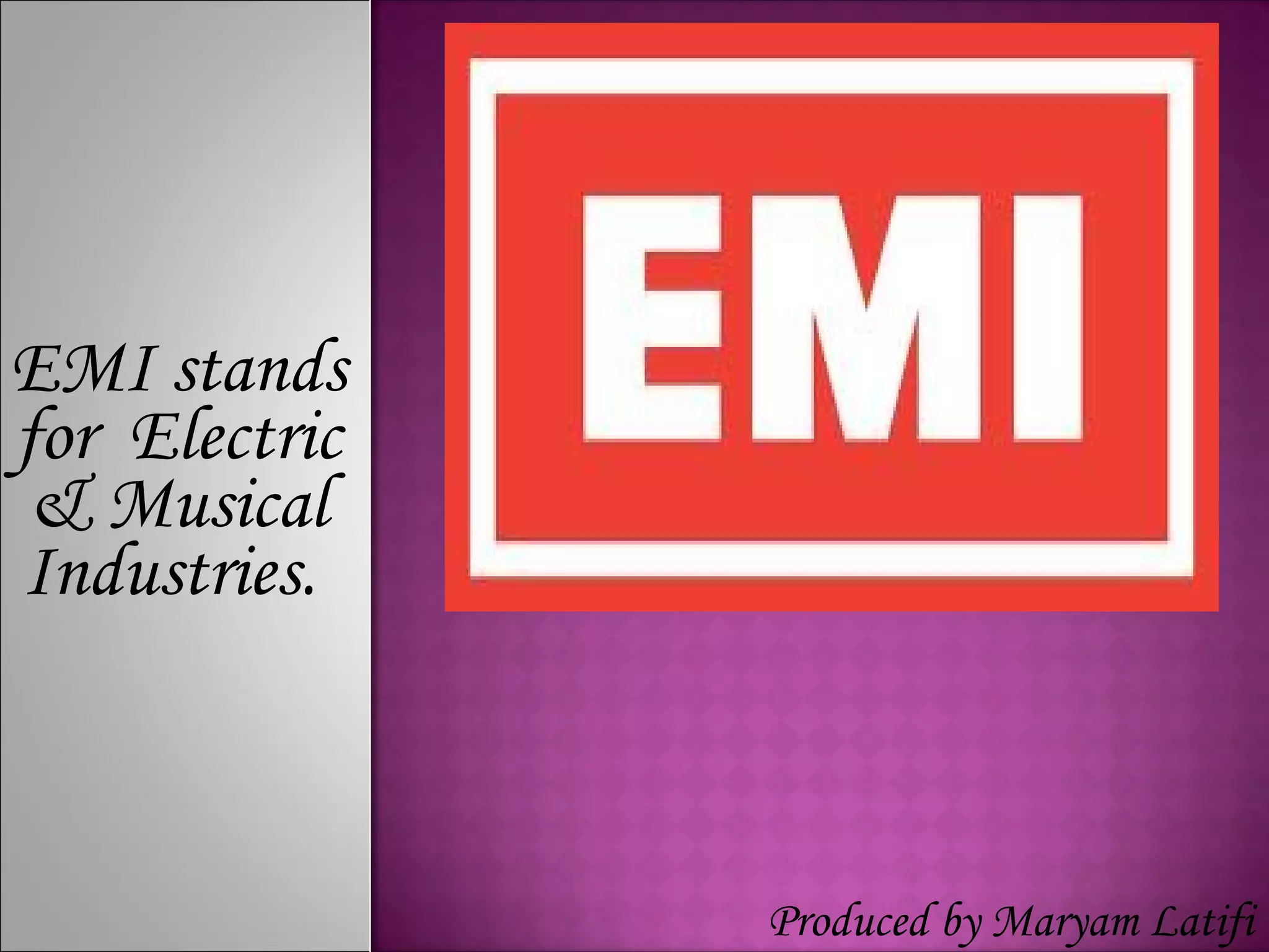 EMI stands for Electric & Musical Industries. It began in 1887 when inventor Emile Berliner demonstrated the first gramophone. In 1931, the Gramophone Company merged with Columbia Graphophone to form EMI. EMI is located at the famous Abbey Road Studios in London and has signed many successful artists over the years such as The Beatles, Pink Floyd, and David Bowie.