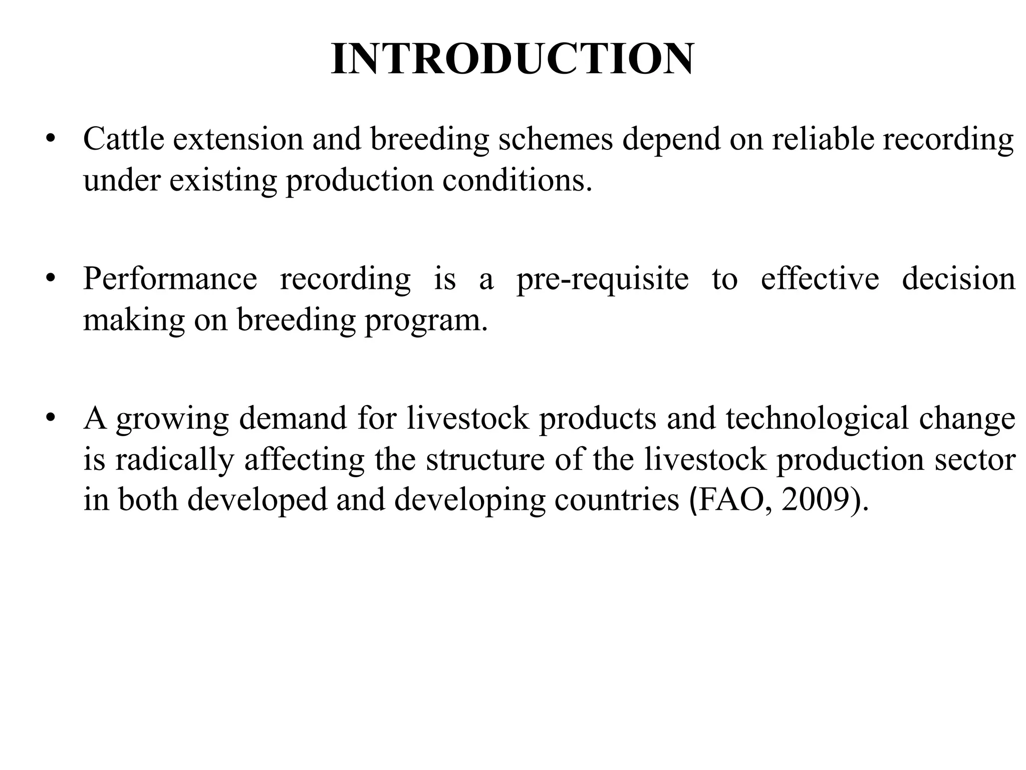 This document discusses the importance of record keeping for animal breeding in Ethiopia. It begins by explaining that reliable recording systems are needed to support cattle breeding programs and effective decision making. It then describes how livestock production in developing countries like Ethiopia is typically characterized by small herds without formal pedigree or performance recording. This limits the implementation of genetic improvement programs. The document outlines the types of records that should be kept, including breeding, production, health, feeding and financial records. It explains that record keeping benefits herd improvement and breeding programs by enabling selection, culling, and controlling inbreeding. However, lack of record keeping in Ethiopia has led to unplanned crossbreeding and increased inbreeding. The document concludes by identifying constraints that