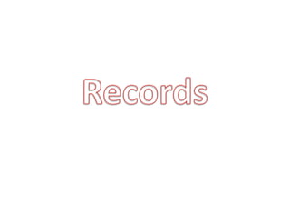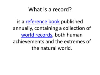 Records is a reference book published annually containing a collection of world records for both human achievements and extremes found in nature. It defines a record as a reference book published each year that lists notable human accomplishments as well as phenomena occurring in the natural world. The book provides brief summaries of records.
