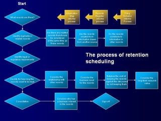 A records retention schedule specifies minimum retention periods for records and authorizes their disposal. It serves as an instruction sheet for caring for and preserving records based on their administrative, legal and historical value. The scheduling process involves analyzing records, determining their value, and establishing retention periods and final dispositions. Records are classified as active, inactive or dead based on their use and retention periods. Inactive records are stored offsite until their value expires and final disposition through destruction or transfer.