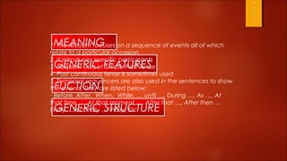 The document discusses the generic features and structure of a recount text. A recount focuses on sequencing events in the past tense and uses temporal language to show order. It introduces participants and uses a structure of orientation, events in sequence, and an optional reorientation to close the events. The sample text provided recounts a personal experience of the narrator forgetting their wallet at a cafe.
