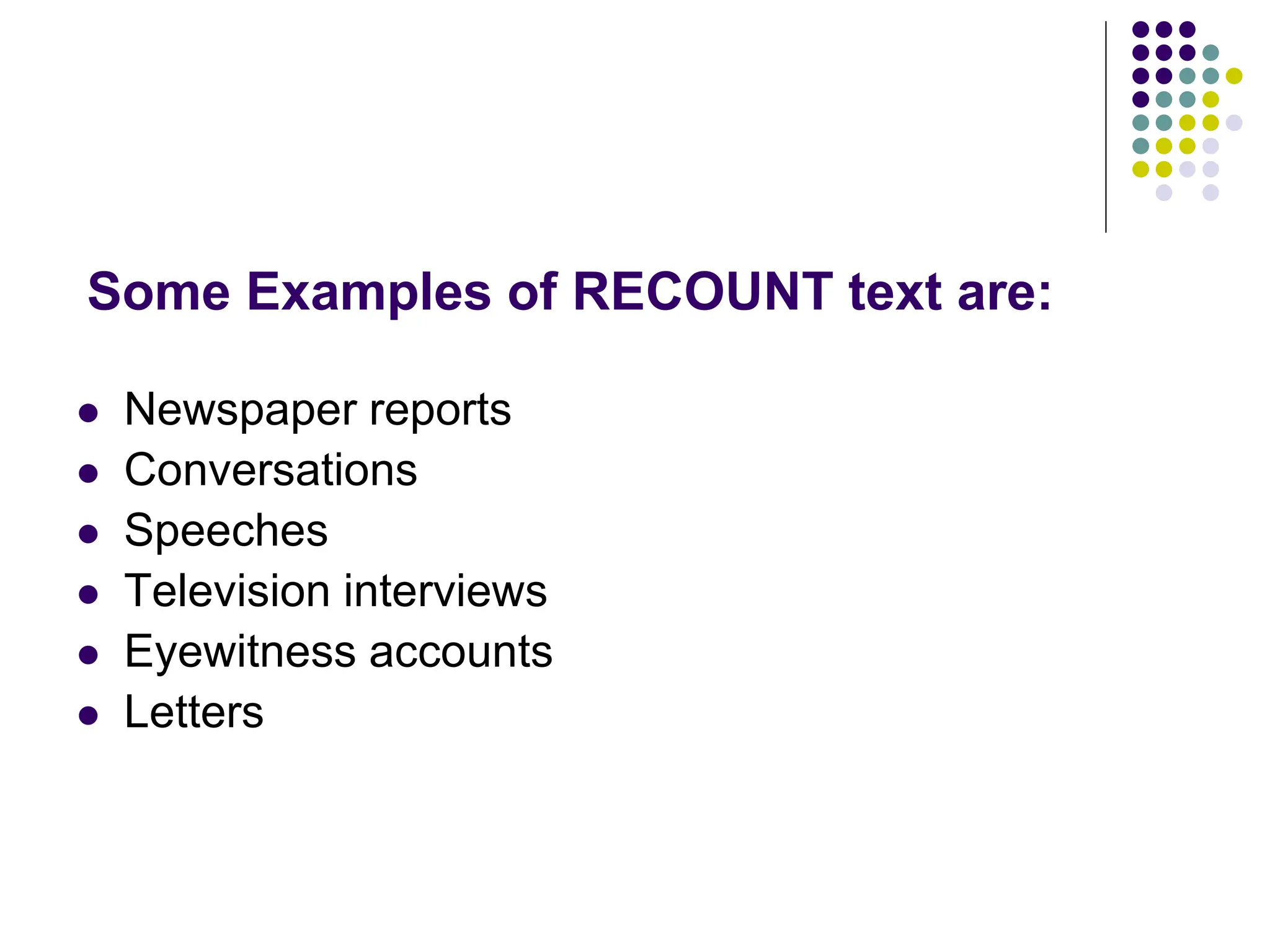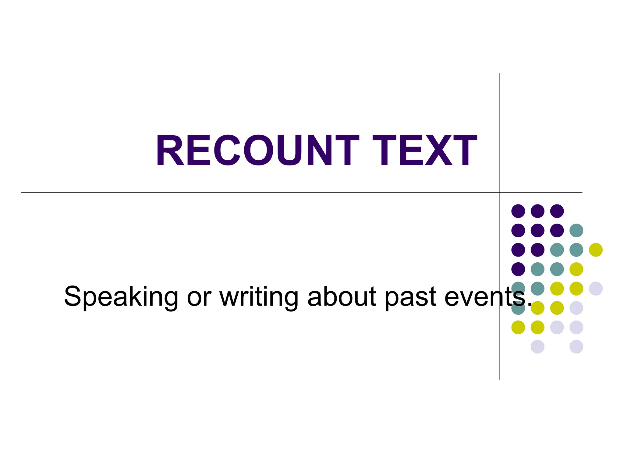 The document discusses recount text, which narrates past events through various forms such as newspaper reports and personal narratives. It outlines the structure of recount texts, including orientation, series of events, and re-orientation, as well as key language features like the use of past tense and chronological order. Additionally, it provides examples and exercises to illustrate recounting experiences, focusing on themes of personal stories and reflections.