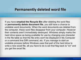This document discusses how to recover deleted Word files on a Windows computer. It explains that even after emptying the Recycle Bin or permanently deleting Word files, there is still a chance to recover them using file recovery software. The document then outlines the steps to recover deleted Word files using a word file recovery program, which includes downloading and launching the software, scanning the computer, previewing recovered files, and saving any desired Word documents that were successfully restored. It also provides some key features of the recovery software such as the ability to retrieve different file types and recover data from various locations on the computer.