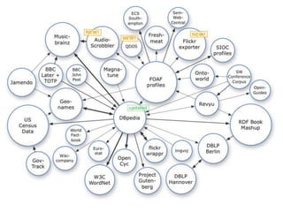 This document discusses knowledge representation and semantic web technologies for representing knowledge. It covers the history of knowledge representation from the 1970s to today, including expert systems, Cyc, computational linguistics, KR programming languages, XML, and the semantic web. It describes the semantic web approach of representing web content as machine-readable data using languages like RDF, OWL, and vocabularies. It also discusses open-source tools and services for publishing and working with semantic web data.