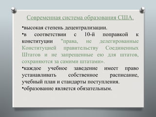 Документ рассматривает систему образования в США, подчеркивая ее децентрализованный характер и историческое развитие от обязательного образования до современного состояния. Обсуждаются ключевые законодательные инициативы, такие как 'No Child Left Behind' и важные моменты, касающиеся равного доступа к образованию для всех, включая программы для меньшинств. Также обращается внимание на финансирование высшего образования и роль местного самоуправления в управлении образовательными учреждениями.